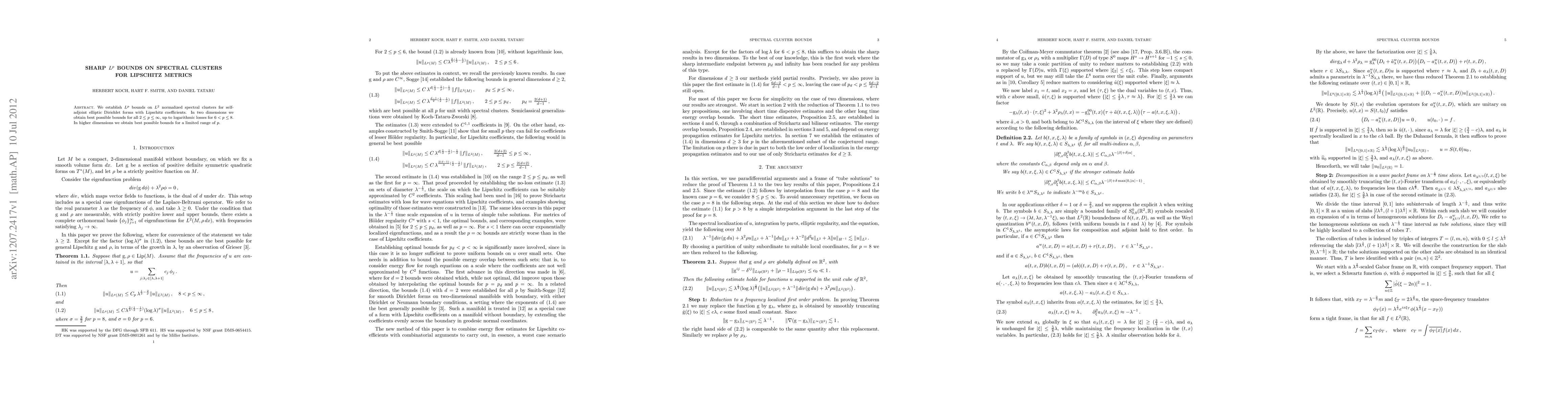 This paper establishes optimal L^p bounds for L^2 normalized spectral clusters in self-adjoint elliptic Dirichlet forms with Lipschitz coefficients, achieving best possible results in two dimensions for p between 2 and infinity, with logarithmic losses for 6 < p ≤ 8, and limited optimal bounds in higher dimensions.