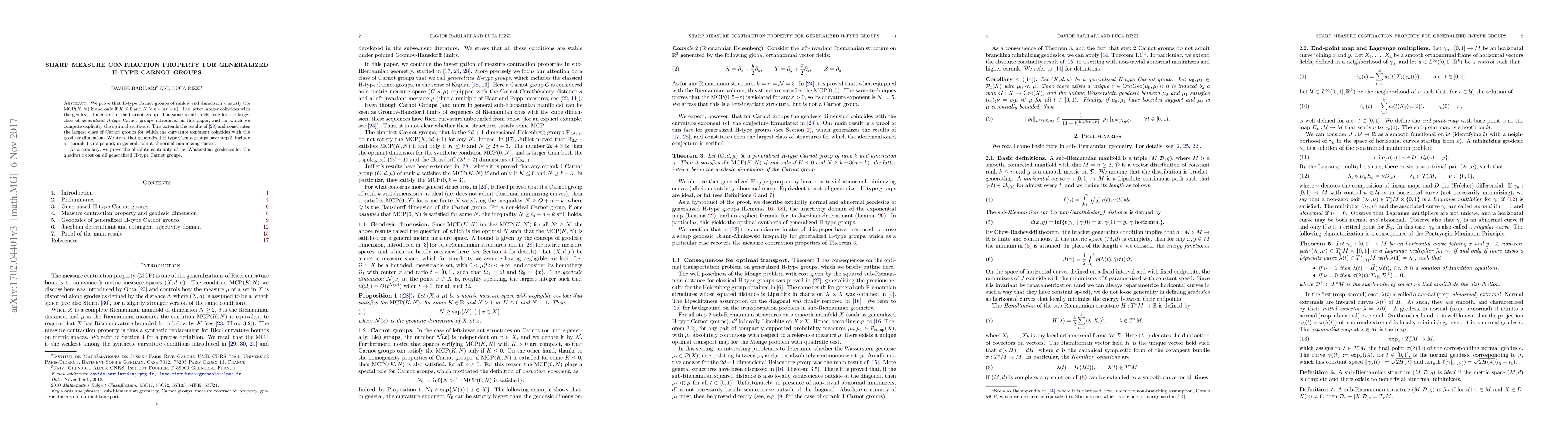 We prove that H-type Carnot groups of rank $k$ and dimension $n$ satisfy the $\mathrm{MCP}(K,N)$ if and only if $K\leq 0$ and $N \geq k+3(n-k)$. The latter integer coincides with the geodesic dimension of the Carnot group. The same result holds true for the larger class of generalized H-type Carnot groups introduced in this paper, and for which we compute explicitly the optimal synthesis. This constitutes the largest class of Carnot groups for which the curvature exponent coincides with the geodesic dimension. We stress that generalized H-type Carnot groups have step 2, include all corank 1 groups and, in general, admit abnormal minimizing curves. As a corollary, we prove the absolute continuity of the Wasserstein geodesics for the quadratic cost on all generalized H-type Carnot groups.