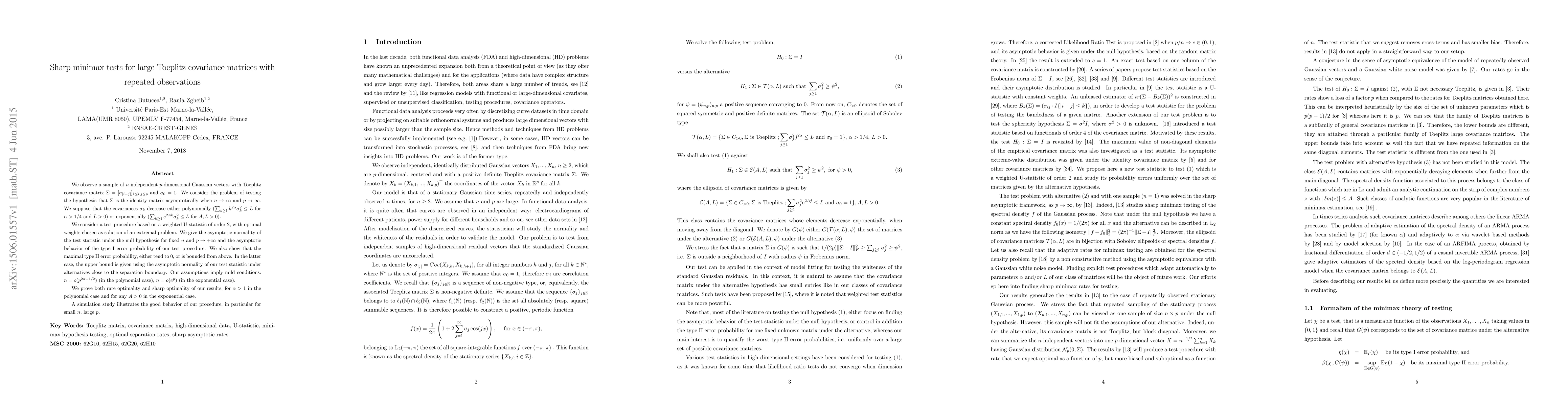 This research paper develops a test procedure for large Toeplitz covariance matrices with repeated observations, showing asymptotic normality and sharp optimality under specific conditions, with applications in hypothesis testing for high-dimensional Gaussian vectors.