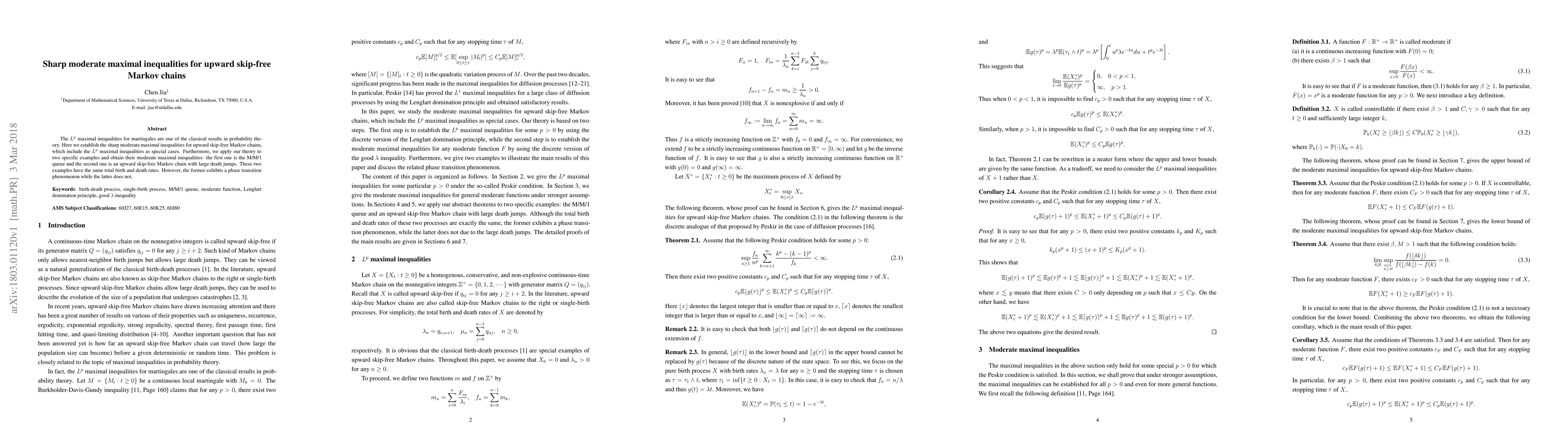 This paper establishes sharp moderate maximal inequalities for upward skip-free Markov chains, extending classical $L^p$ maximal inequalities for martingales. It applies the theory to specific examples, including the M/M/1 queue and an upward skip-free Markov chain with large death jumps, highlighting a phase transition in the former but not in the latter.