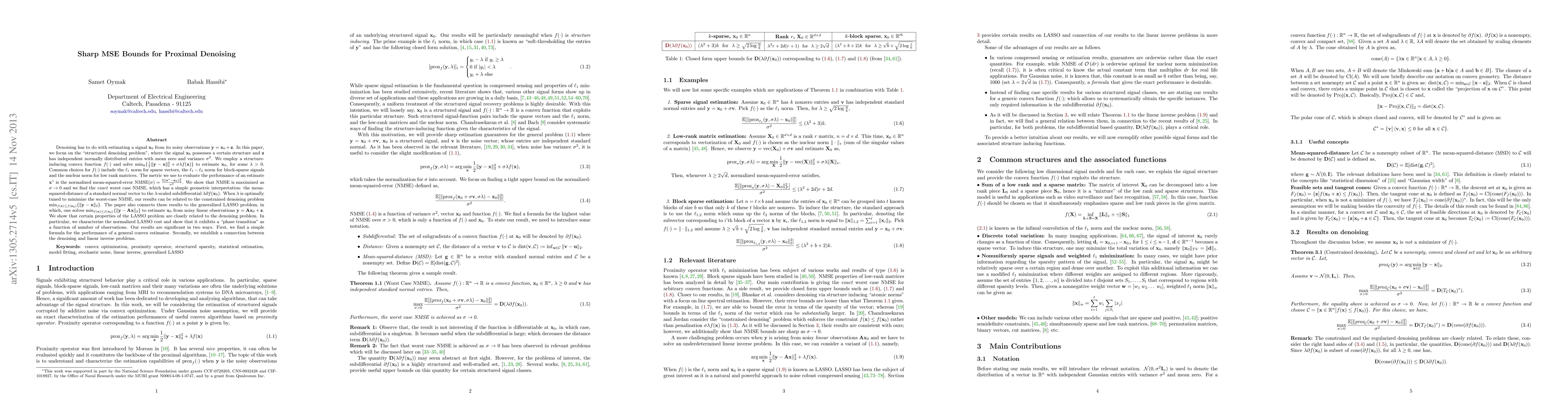 Denoising has to do with estimating a signal $x_0$ from its noisy observations $y=x_0+z$. In this paper, we focus on the "structured denoising problem", where the signal $x_0$ possesses a certain structure and $z$ has independent normally distributed entries with mean zero and variance $\sigma^2$. We employ a structure-inducing convex function $f(\cdot)$ and solve $\min_x\{\frac{1}{2}\|y-x\|_2^2+\sigma\lambda f(x)\}$ to estimate $x_0$, for some $\lambda>0$. Common choices for $f(\cdot)$ include the $\ell_1$ norm for sparse vectors, the $\ell_1-\ell_2$ norm for block-sparse signals and the nuclear norm for low-rank matrices. The metric we use to evaluate the performance of an estimate $x^*$ is the normalized mean-squared-error $\text{NMSE}(\sigma)=\frac{\mathbb{E}\|x^*-x_0\|_2^2}{\sigma^2}$. We show that NMSE is maximized as $\sigma\rightarrow 0$ and we find the \emph{exact} worst case NMSE, which has a simple geometric interpretation: the mean-squared-distance of a standard normal vector to the $\lambda$-scaled subdifferential $\lambda\partial f(x_0)$. When $\lambda$ is optimally tuned to minimize the worst-case NMSE, our results can be related to the constrained denoising problem $\min_{f(x)\leq f(x_0)}\{\|y-x\|_2\}$. The paper also connects these results to the generalized LASSO problem, in which, one solves $\min_{f(x)\leq f(x_0)}\{\|y-Ax\|_2\}$ to estimate $x_0$ from noisy linear observations $y=Ax_0+z$. We show that certain properties of the LASSO problem are closely related to the denoising problem. In particular, we characterize the normalized LASSO cost and show that it exhibits a "phase transition" as a function of number of observations. Our results are significant in two ways. First, we find a simple formula for the performance of a general convex estimator. Secondly, we establish a connection between the denoising and linear inverse problems.