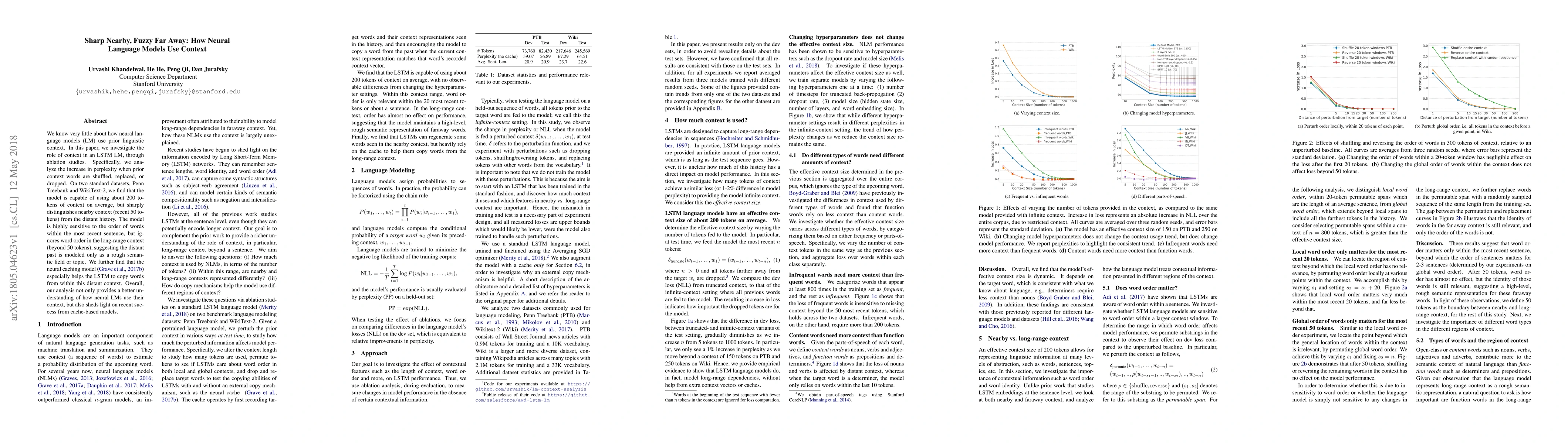 We know very little about how neural language models (LM) use prior linguistic context. In this paper, we investigate the role of context in an LSTM LM, through ablation studies. Specifically, we analyze the increase in perplexity when prior context words are shuffled, replaced, or dropped. On two standard datasets, Penn Treebank and WikiText-2, we find that the model is capable of using about 200 tokens of context on average, but sharply distinguishes nearby context (recent 50 tokens) from the distant history. The model is highly sensitive to the order of words within the most recent sentence, but ignores word order in the long-range context (beyond 50 tokens), suggesting the distant past is modeled only as a rough semantic field or topic. We further find that the neural caching model (Grave et al., 2017b) especially helps the LSTM to copy words from within this distant context. Overall, our analysis not only provides a better understanding of how neural LMs use their context, but also sheds light on recent success from cache-based models.