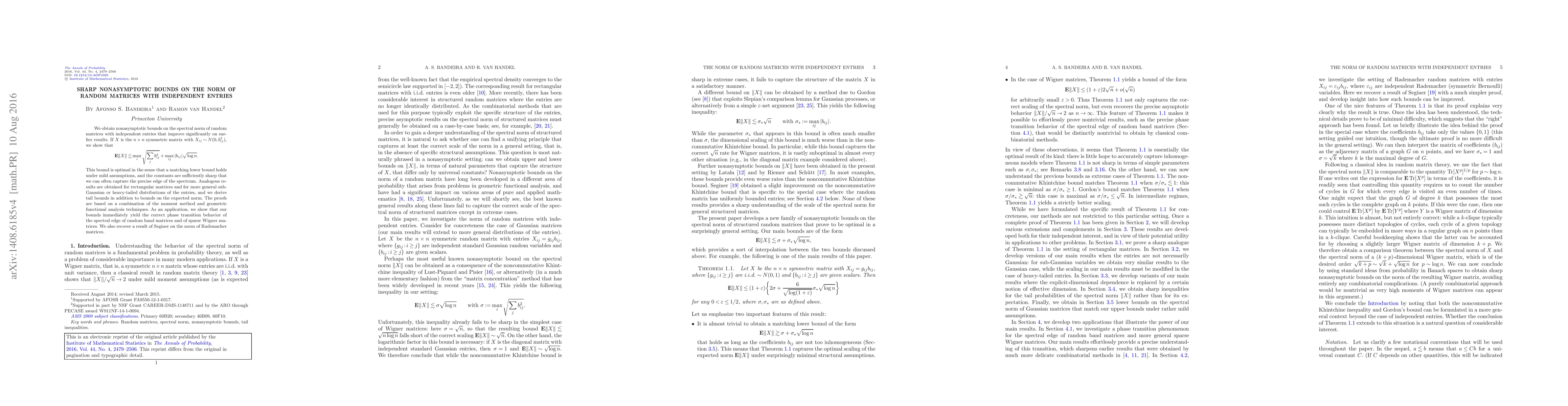 This paper presents sharp nonasymptotic bounds on the spectral norm of random matrices with independent entries, improving prior results. The authors derive bounds that match lower bounds under mild assumptions, demonstrating optimality and sharpness of the constants. The findings extend to rectangular matrices and various entry distributions, with applications to random band matrices and sparse Wigner matrices.