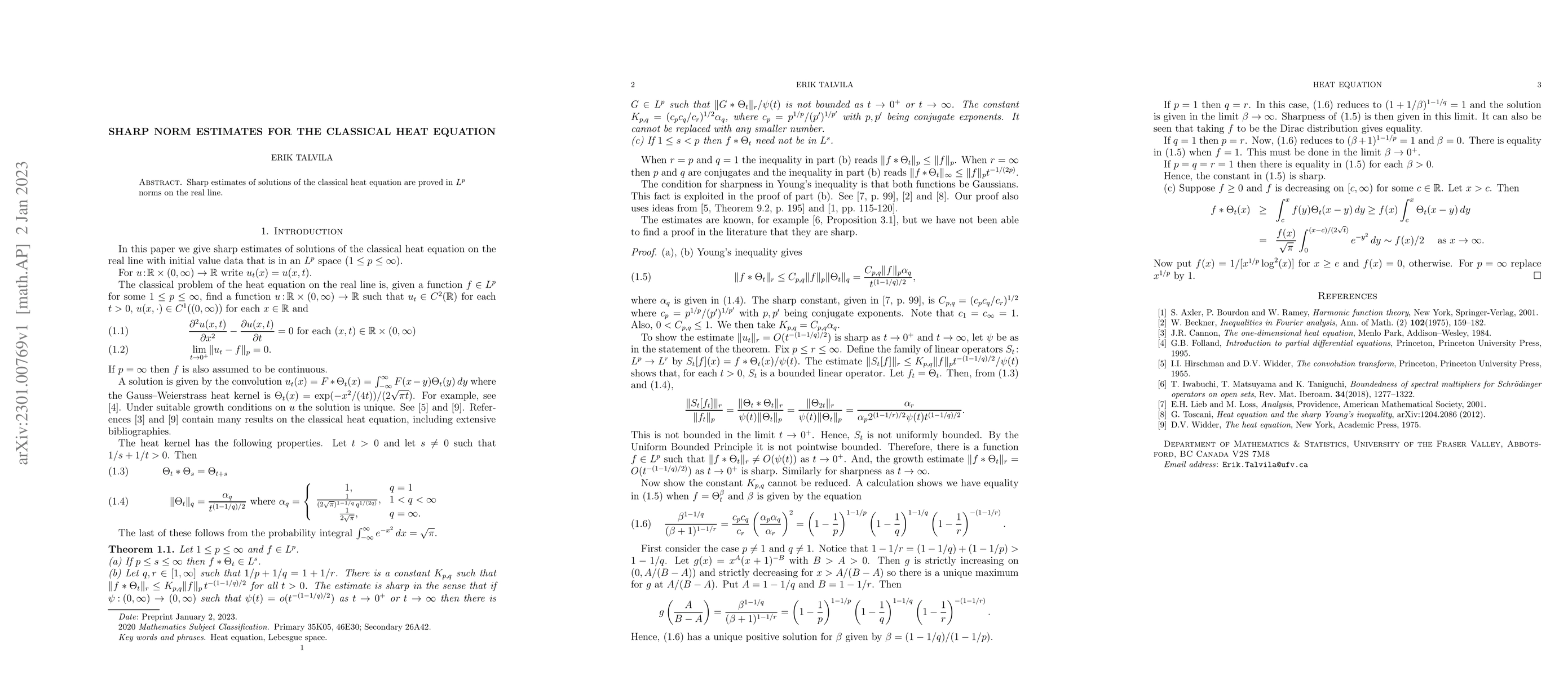 Summary: This paper establishes precise $L^p$ norm estimates for solutions of the classical heat equation on the real line, providing sharp bounds on the behavior of these solutions.