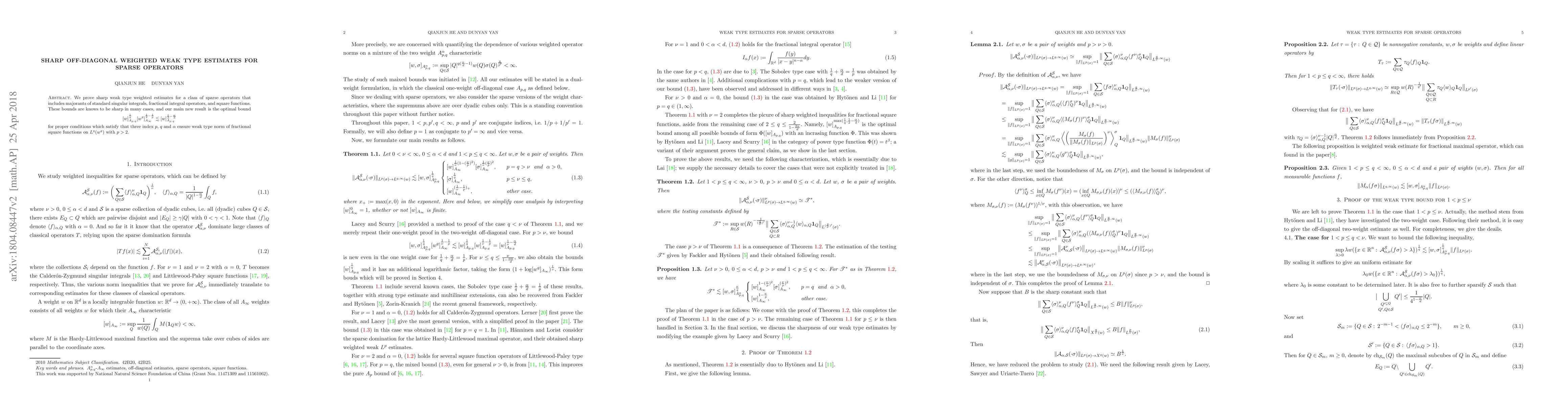 The paper proves sharp weak type weighted estimates for a class of sparse operators, including fractional singular integrals and Marcinkiewicz integral operators, with an optimal bound that relates the $A_{p,q}$ and $A_ heta$ norms.