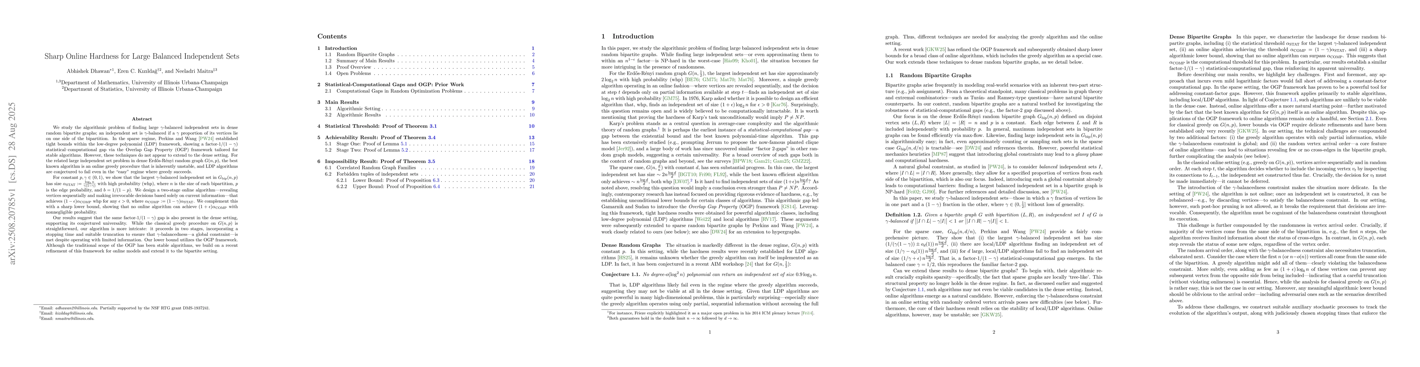 We study the algorithmic problem of finding large $\gamma$-balanced independent sets in dense random bipartite graphs; an independent set is $\gamma$-balanced if a $\gamma$ proportion of its vertices lie on one side of the bipartition. In the sparse regime, Perkins and Wang established tight bounds within the low-degree polynomial (LDP) framework, showing a factor-$1/(1-\gamma)$ statistical-computational gap via the Overlap Gap Property (OGP) framework tailored for stable algorithms. However, these techniques do not appear to extend to the dense setting. For the related large independent set problem in dense random graph, the best known algorithm is an online greedy procedure that is inherently unstable, and LDP algorithms are conjectured to fail even in the "easy" regime where greedy succeeds. We show that the largest $\gamma$-balanced independent set in dense random bipartite graphs has size $\alpha:=\frac{\log_b n}{\gamma(1-\gamma)}$ whp, where $n$ is the size of each bipartition, $p$ is the edge probability, and $b=1/(1-p)$. We design an online algorithm that achieves $(1-\epsilon)(1-\gamma)\alpha$ whp for any $\epsilon>0$. We complement this with a sharp lower bound, showing that no online algorithm can achieve $(1+\epsilon)(1-\gamma)\alpha$ with nonnegligible probability. Our results suggest that the same factor-$1/(1-\gamma)$ gap is also present in the dense setting, supporting its conjectured universality. While the classical greedy procedure on $G(n,p)$ is straightforward, our algorithm is more intricate: it proceeds in two stages, incorporating a stopping time and suitable truncation to ensure that $\gamma$-balancedness-a global constraint-is met despite operating with limited information. Our lower bound utilizes the OGP framework; we build on a recent refinement of this framework for online models and extend it to the bipartite setting.