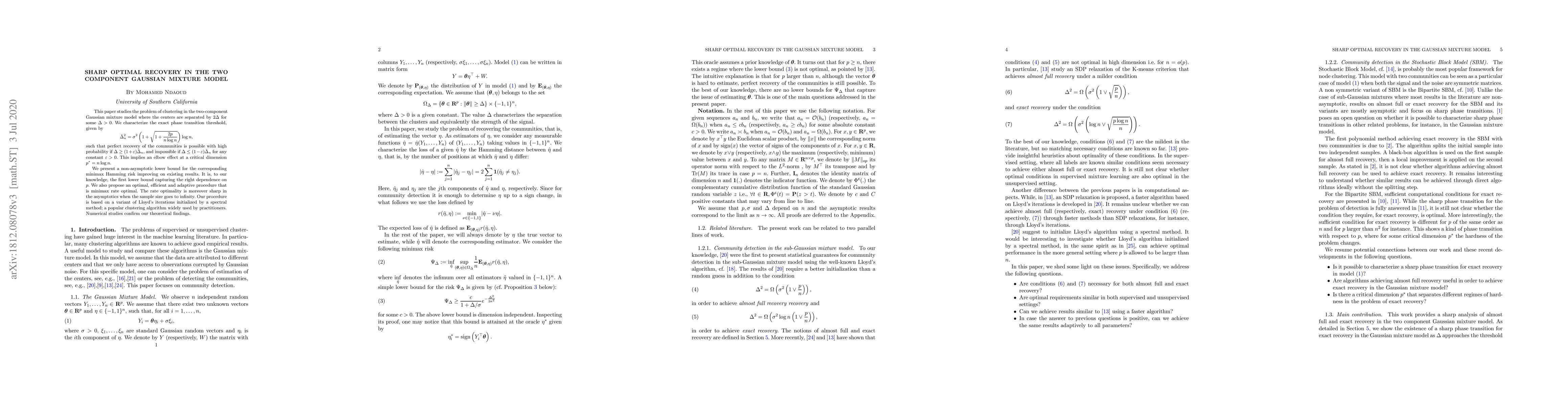 This paper investigates clustering in a two-component Gaussian mixture model with separated centers, determining the exact phase transition threshold for optimal recovery. It introduces a new minimax lower bound and proposes an adaptive clustering procedure based on a spectral method, which is shown to be minimax rate optimal.