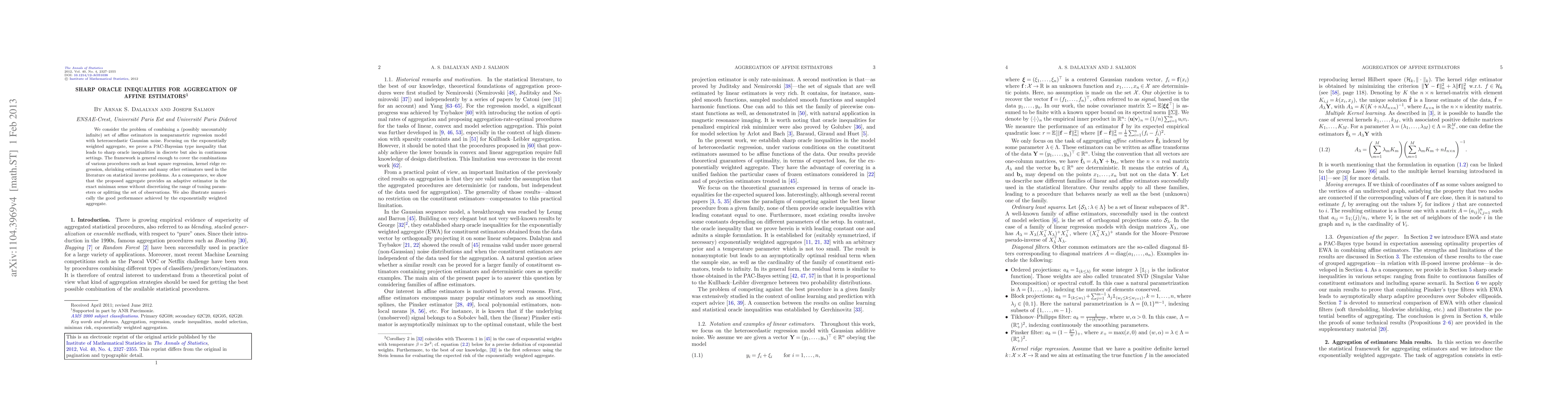We consider the problem of combining a (possibly uncountably infinite) set of affine estimators in non-parametric regression model with heteroscedastic Gaussian noise. Focusing on the exponentially weighted aggregate, we prove a PAC-Bayesian type inequality that leads to sharp oracle inequalities in discrete but also in continuous settings. The framework is general enough to cover the combinations of various procedures such as least square regression, kernel ridge regression, shrinking estimators and many other estimators used in the literature on statistical inverse problems. As a consequence, we show that the proposed aggregate provides an adaptive estimator in the exact minimax sense without neither discretizing the range of tuning parameters nor splitting the set of observations. We also illustrate numerically the good performance achieved by the exponentially weighted aggregate.