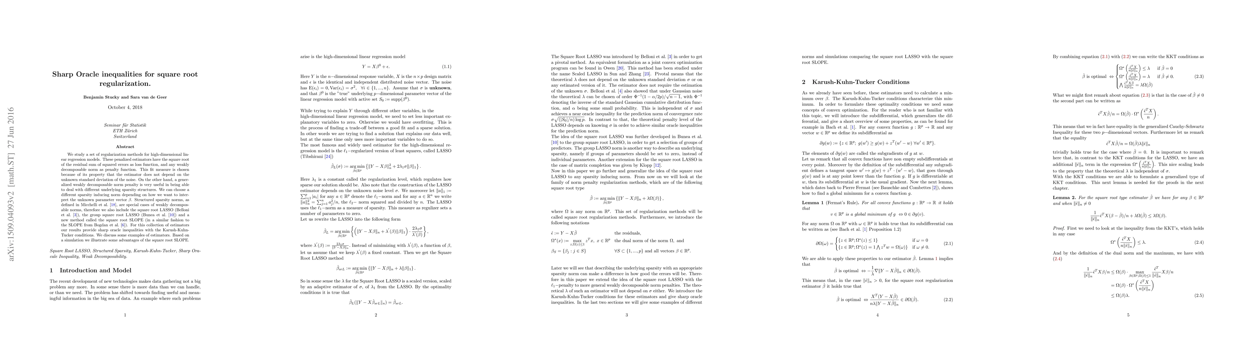 The paper studies regularization methods for high-dimensional linear regression models using the square root of the residual sum of squared errors as the loss function and weakly decomposable norms as penalty functions. It provides sharp oracle inequalities for these estimators under Karush-Kuhn-Tucker conditions.