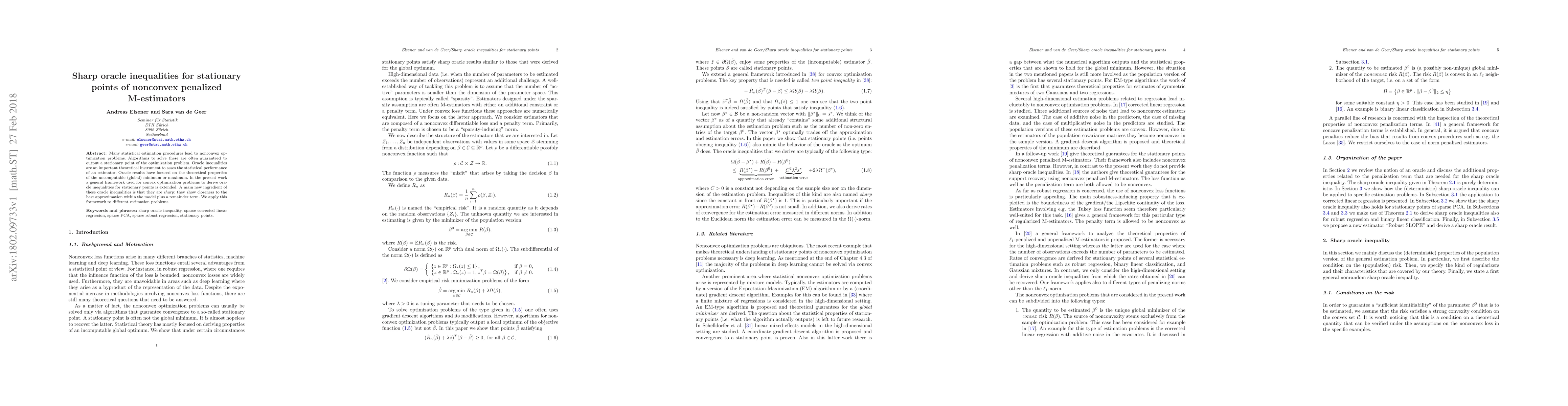 Many statistical estimation procedures lead to nonconvex optimization problems. Algorithms to solve these are often guaranteed to output a stationary point of the optimization problem. Oracle inequalities are an important theoretical instrument to asses the statistical performance of an estimator. Oracle results have focused on the theoretical properties of the uncomputable (global) minimum or maximum. In the present work a general framework used for convex optimization problems to derive oracle inequalities for stationary points is extended. A main new ingredient of these oracle inequalities is that they are sharp: they show closeness to the best approximation within the model plus a remainder term. We apply this framework to different estimation problems.