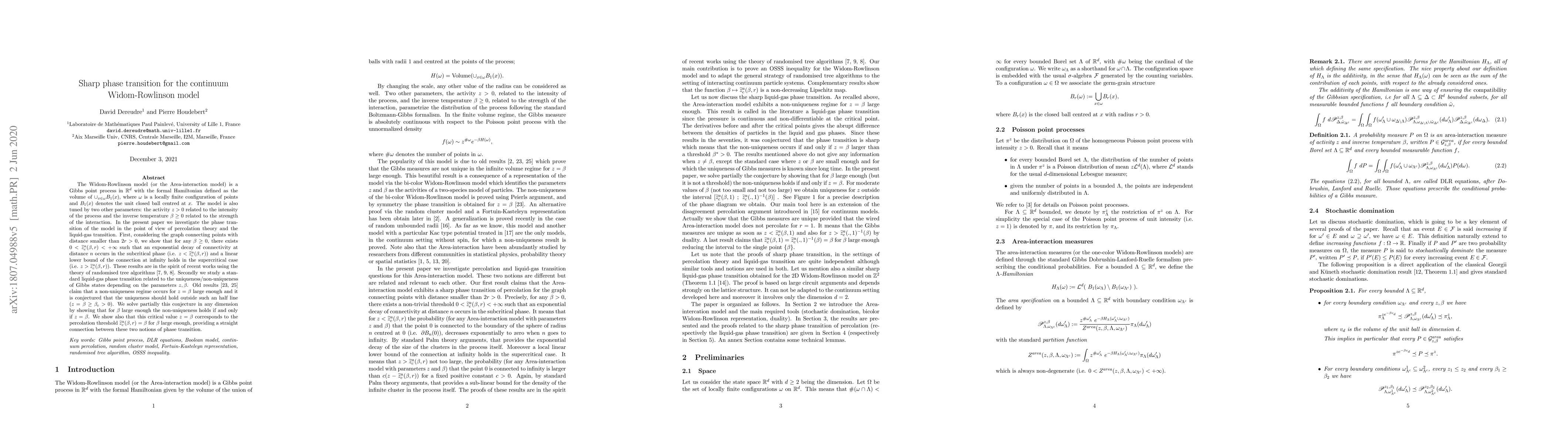 The Widom-Rowlinson model (or the Area-interaction model) is a Gibbs point process in $\mathbb{R}^d$ with the formal Hamiltonian $H(\omega)=\text{Volume}(\cup_{x\in\omega} B_1(x))$, where $\omega$ is a locally finite configuration of points and $B_1(x)$ denotes the unit closed ball centred at $x$. The model is tuned by two parameters: the activity $z>0$ and the inverse temperature $\beta\ge 0$. We investigate the phase transition of the model in the point of view of percolation theory and the liquid-gas transition. First, considering the graph connecting points with distance smaller than $2r>0$, we show that for any $\beta>0$, there exists $0<\tilde{z}^a(\beta, r)<+\infty$ such that an exponential decay of connectivity at distance $n$ occurs in the subcritical phase and a linear lower bound of the connection at infinity holds in the supercritical case. Secondly we study a standard liquid-gas phase transition related to the uniqueness/non-uniqueness of Gibbs states depending on the parameters $z,\beta$. Old results claim that a non-uniqueness regime occurs for $z=\beta$ large enough and it is conjectured that the uniqueness should hold outside such an half line ($z=\beta\ge \beta_c>0$). We solve partially this conjecture by showing that for $\beta$ large enough the non-uniqueness holds if and only if $z=\beta$. We show also that this critical value $z=\beta$ corresponds to the percolation threshold $ \tilde{z}^a(\beta, r)=\beta$ for $\beta$ large enough, providing a straight connection between these two notions of phase transition.