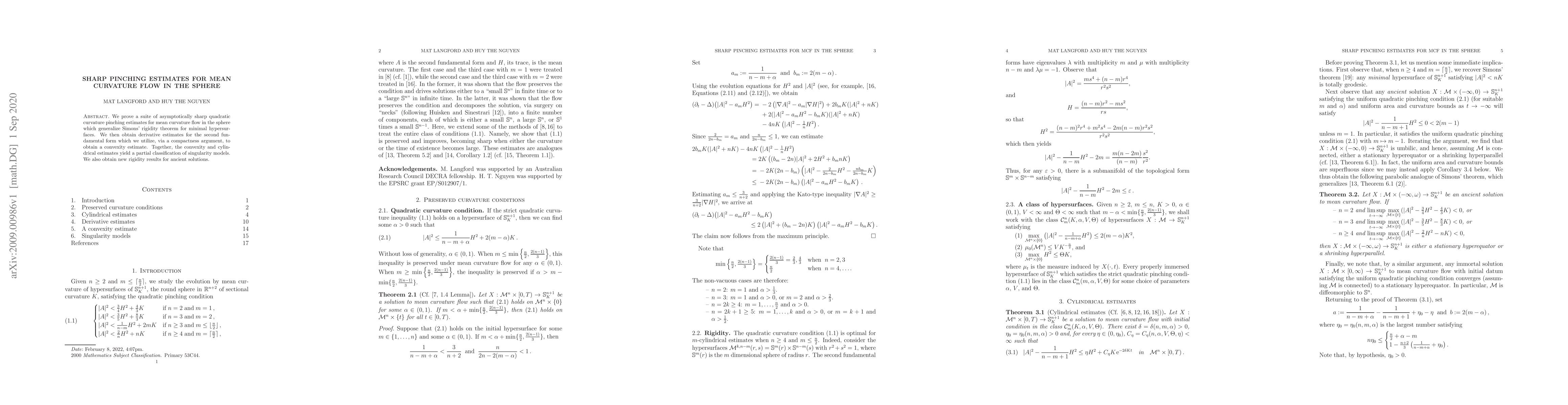 We prove a suite of asymptotically sharp quadratic curvature pinching estimates for mean curvature flow in the sphere which generalize Simons' rigidity theorem for minimal hypersurfaces. We then obtain derivative estimates for the second fundamental form which we utilize, via a compactness argument, to obtain a convexity estimate. Together, the convexity and cylindrical estimates yield a partial classification of singularity models. We also obtain new rigidity results for ancient solutions.