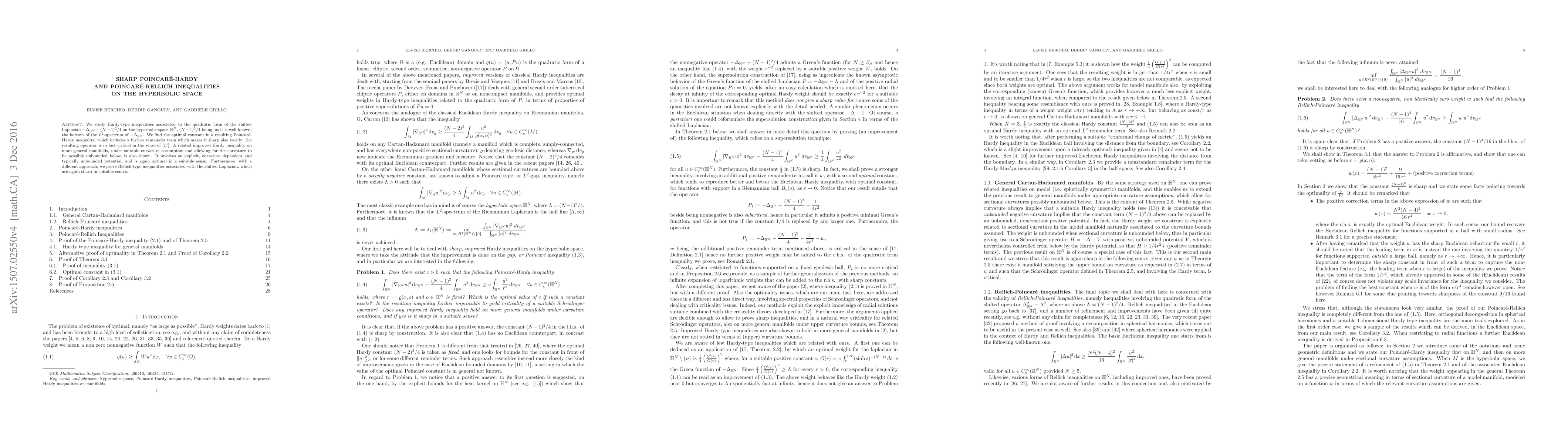 We study Hardy-type inequalities associated to the quadratic form of the shifted Laplacian $-\Delta_{\mathbb H^N}-(N-1)^2/4$ on the hyperbolic space ${\mathbb H}^N$, $(N-1)^2/4$ being, as it is well-known, the bottom of the $L^2$-spectrum of $-\Delta_{\mathbb H^N}$. We find the optimal constant in the resulting Poincar\'e-Hardy inequality, which includes a further remainder term which makes it sharp also locally. A related inequality under suitable curvature assumption on more general manifolds is also shown. Similarly, we prove Rellich-type inequalities associated with the shifted Laplacian, in which at least one of the constant involved is again sharp.