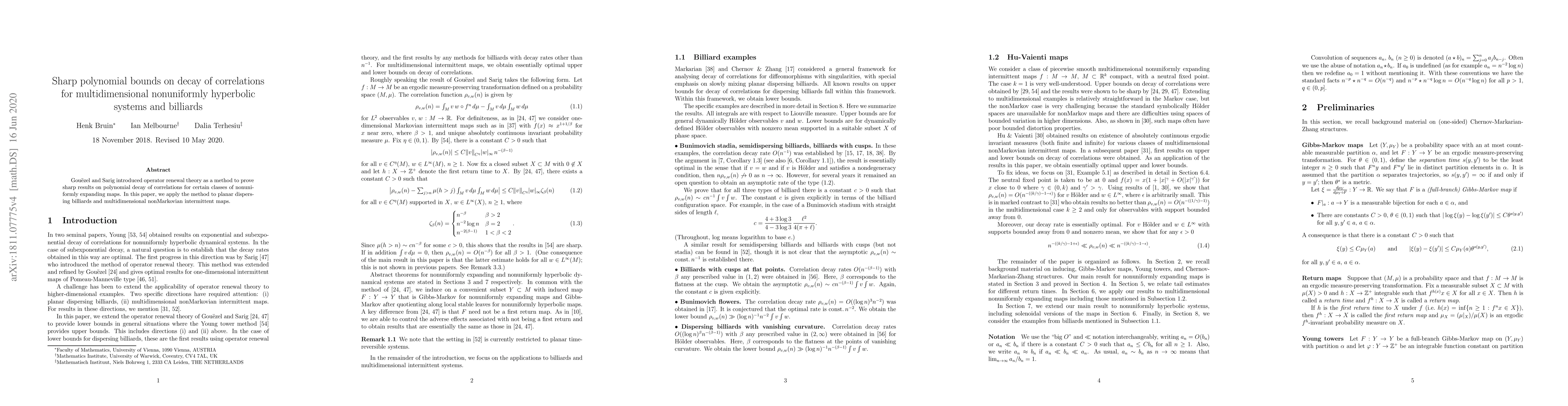 This paper employs operator renewal theory to establish sharp polynomial decay bounds on correlations for planar dispersing billiards and multidimensional nonMarkovian intermittent maps, extending previous results on nonuniformly hyperbolic systems. The method provides a novel approach to understanding the dynamics in these complex systems.