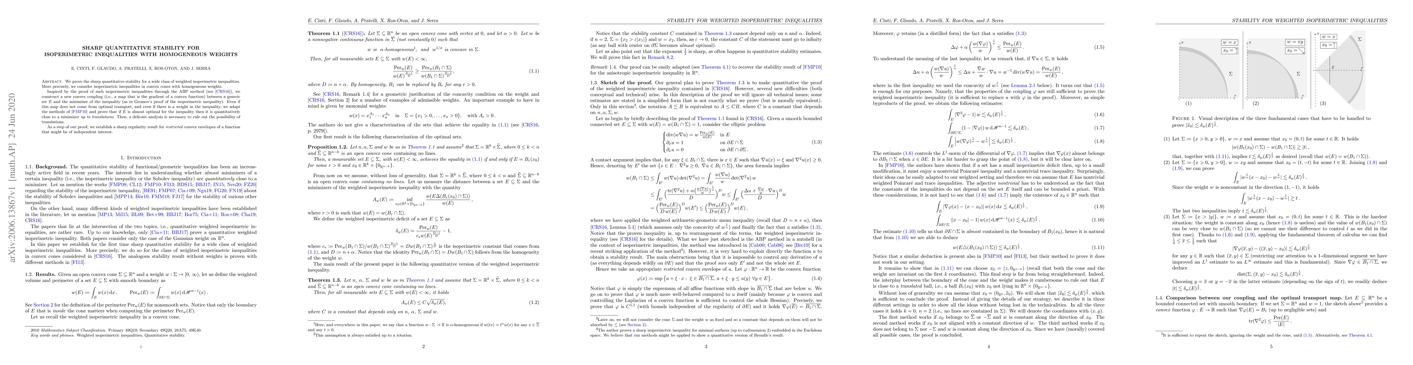 We prove the sharp quantitative stability for a wide class of weighted isoperimetric inequalities. More precisely, we consider isoperimetric inequalities in convex cones with homogeneous weights. Inspired by the proof of such isoperimetric inequalities through the ABP method, we construct a new convex coupling (i.e., a map that is the gradient of a convex function) between a generic set $E$ and the minimizer of the inequality (as in Gromov's proof of the isoperimetric inequality). Even if this map does not come from optimal transport, and even if there is a weight in the inequality, we adapt the methods of Figalli-Maggi-Pratelli and prove that if $E$ is almost optimal for the inequality then it is quantitatively close to a minimizer up to translations. Then, a delicate analysis is necessary to rule out the possibility of translations. As a step of our proof, we establish a sharp regularity result for restricted convex envelopes of a function that might be of independent interest.