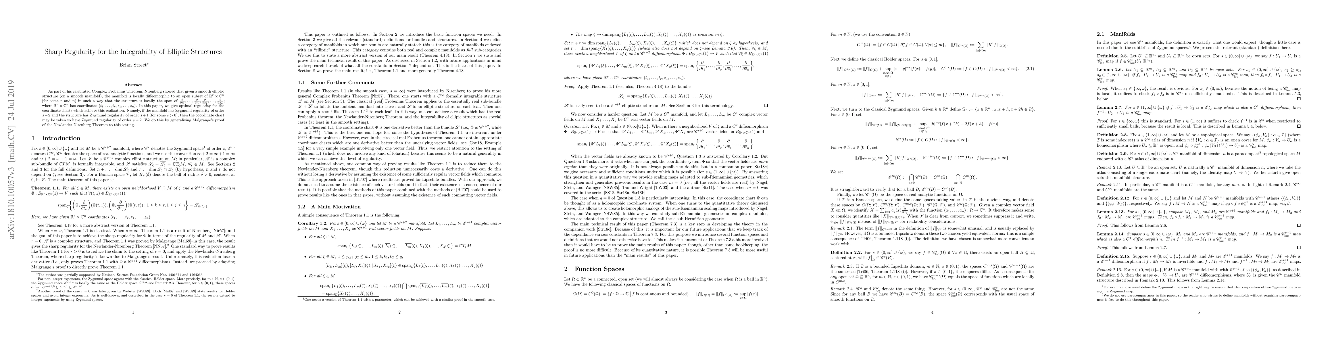 As part of his celebrated Complex Frobenius Theorem, Nirenberg showed that given a smooth elliptic structure (on a smooth manifold), the manifold is locally diffeomorphic to an open subset of $\mathbb{R}^r\times \mathbb{C}^n$ (for some $r$ and $n$) in such a way that the structure is locally the span of $\frac{\partial}{\partial t_1},\ldots, \frac{\partial}{\partial t_r},\frac{\partial}{\partial \overline{z}_1},\ldots, \frac{\partial}{\partial \overline{z}_n}$; where $\mathbb{R}^r\times \mathbb{C}^n$ has coordinates $(t_1,\ldots, t_r, z_1,\ldots, z_n)$. In this paper, we give optimal regularity for the coordinate charts which achieve this realization. Namely, if the manifold has Zygmund regularity of order $s+2$ and the structure has Zygmund regularity of order $s+1$ (for some $s>0$), then the coordinate chart may be taken to have Zygmund regularity of order $s+2$. We do this by generalizing Malgrange's proof of the Newlander-Nirenberg Theorem to this setting.