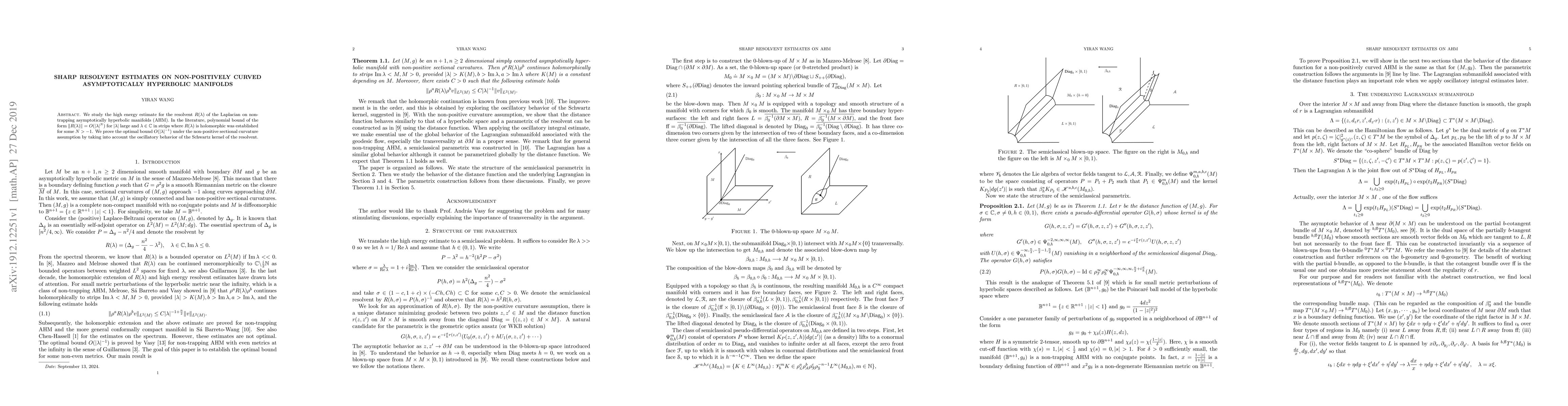 We study the high energy estimate for the resolvent $R(\lambda)$ of the Laplacian on non-trapping asymptotically hyperbolic manifolds (AHM). In the literature, polynomial bound of the form $\|R(\lambda)\| = O(|\lambda|^{N})$ for $|\lambda|$ large and $\lambda\in \mathbb{C}$ in strips where $R(\lambda)$ is holomorphic was established for some $N > -1$. We prove the optimal bound $O(|\lambda|^{-1})$ under the non-positive sectional curvature assumption by taking into account the oscillatory behavior of the Schwartz kernel of the resolvent.
