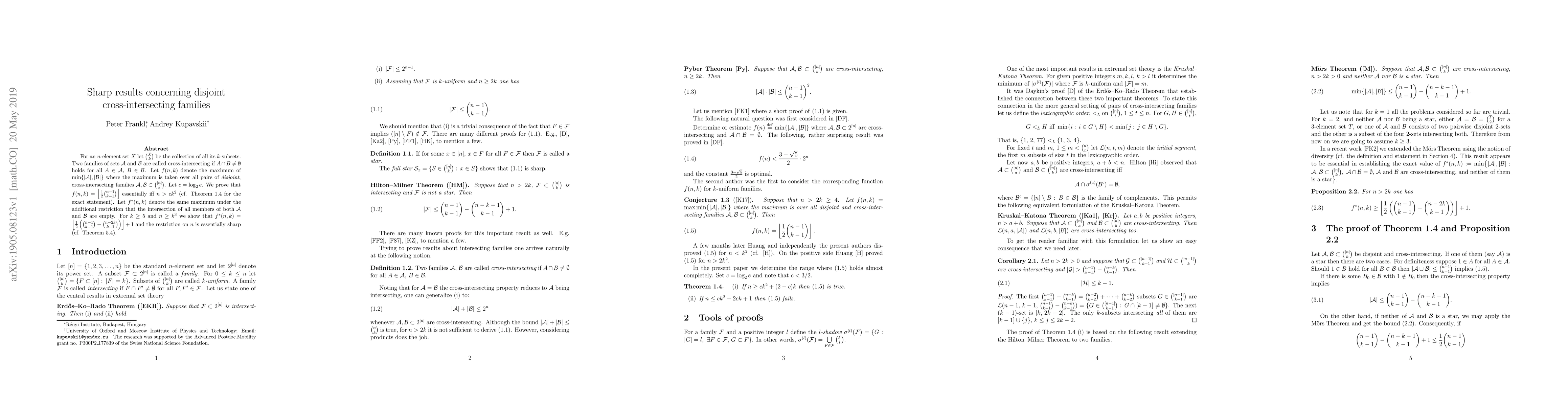 This paper establishes a limit on the size of disjoint cross-intersecting families of subsets in a set with n elements, finding that the maximum family size is approximately half the number of ways to choose k-1 elements from n-1, depending on whether the intersection of all sets is empty or not.