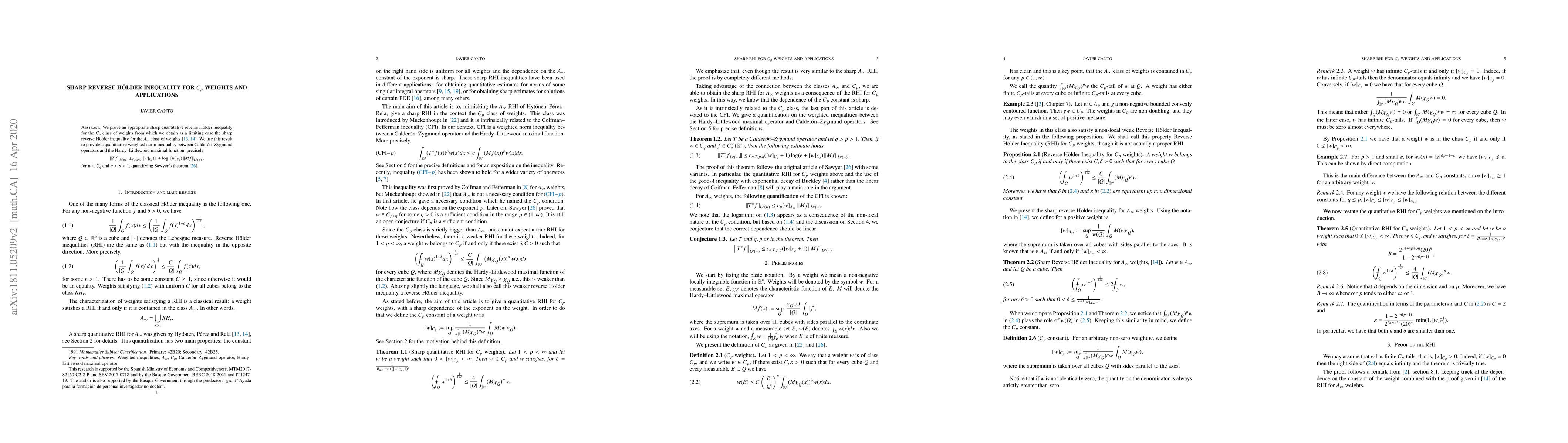 We prove an appropriate sharp quantitative reverse H\"older inequality for the $C_p$ class of weights from which we obtain as a limiting case the sharp reverse H\"older inequality for the $A_\infty$ class of weights. We use this result to provide a quantitative weighted norm inequality between Calder\'on-Zygmund operators and the Hardy-Littlewood maximal function, precisely \[ \|Tf\|_{L^p(w)} \lesssim_{T,n,p,q} [w]_{C_q}(1+\log^+[w]_{C_q})\|Mf\|_{L^p(w)}, \] for $w\in C_q$ and $q>p>1$, quantifying Sawyer's theorem.