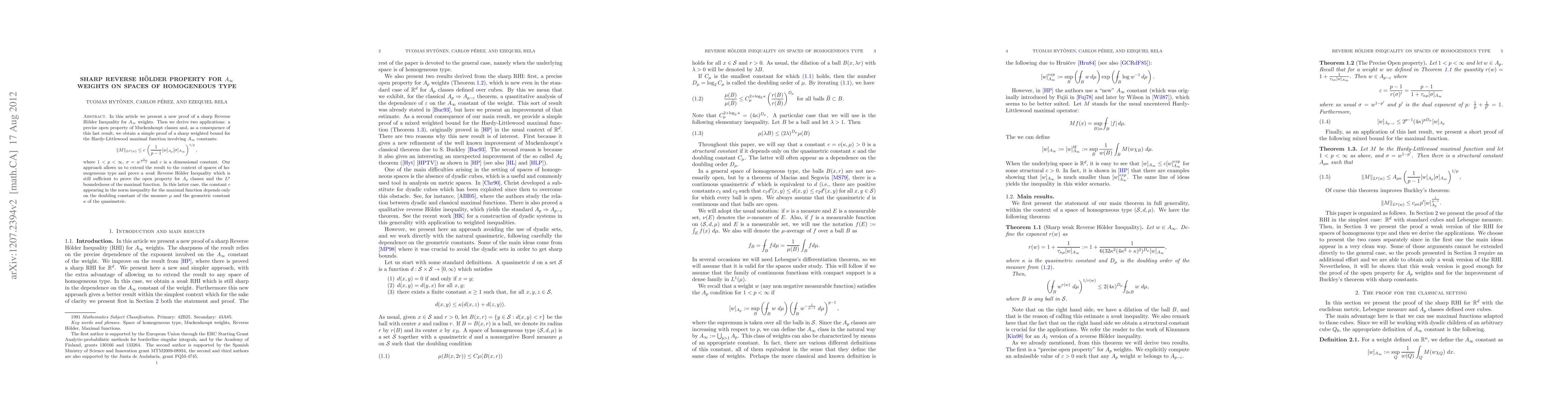 This paper presents a new proof of a sharp Reverse Hölder Inequality for $A_\infty$ weights in spaces of homogeneous type, and derives applications including a precise open property of Muckenhoupt classes and a sharp weighted bound for the Hardy-Littlewood maximal function involving $A_\infty$ constants.