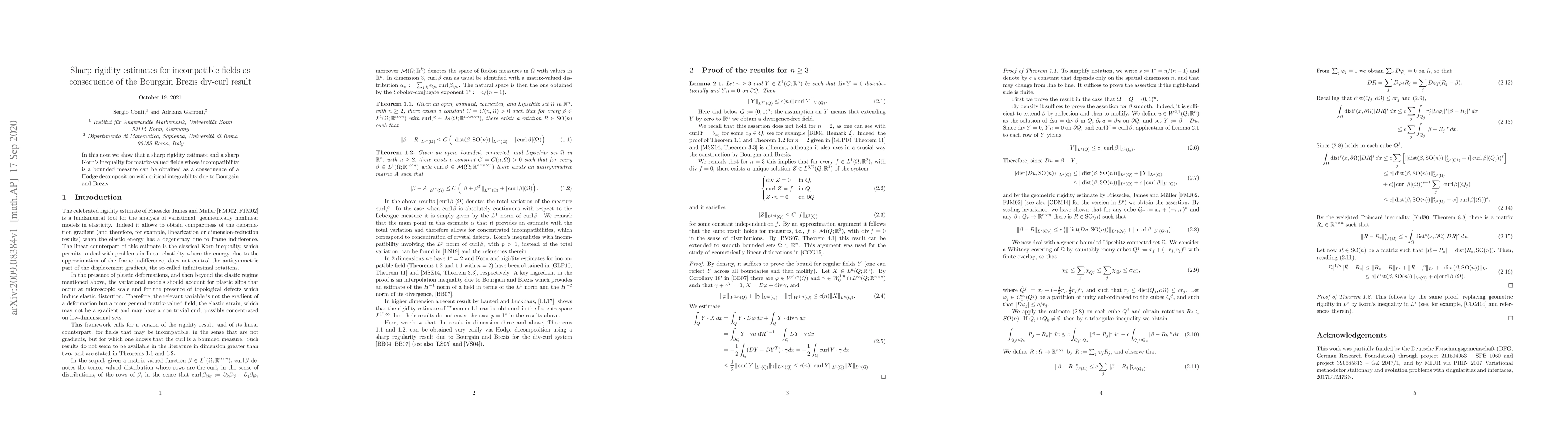 Summary: This paper demonstrates that sharp rigidity estimates and a refined Korn's inequality for matrix-valued fields with bounded measure incompatibility are derived from a Hodge decomposition with critical integrability established by Bourgain and Brezis.