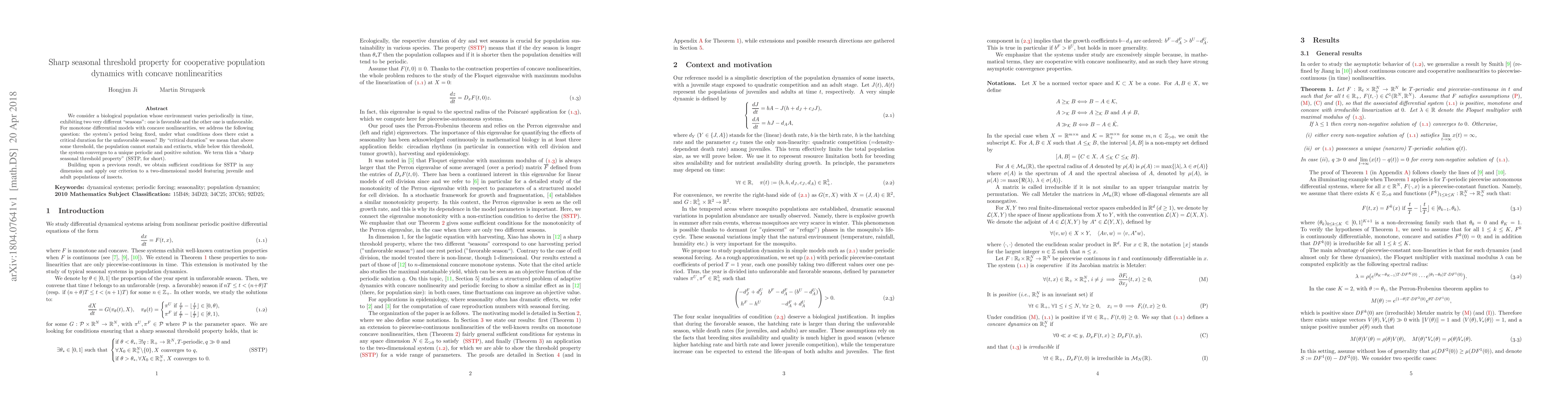 We consider a biological population whose environment varies periodically in time, exhibiting two very different "seasons" : one is favorable and the other one is unfavorable. For monotone differential models with concave nonlinearities, we address the following question: the system's period being fixed, under what conditions does there exist a critical duration for the unfavorable season? By "critical duration" we mean that above some threshold, the population cannot sustain and extincts, while below this threshold, the system converges to a unique periodic and positive solution. We term this a "sharp seasonal threshold property" (SSTP, for short). Building upon a previous result, we obtain sufficient conditions for SSTP in any dimension and apply our criterion to a two-dimensional model featuring juvenile and adult populations of insects.