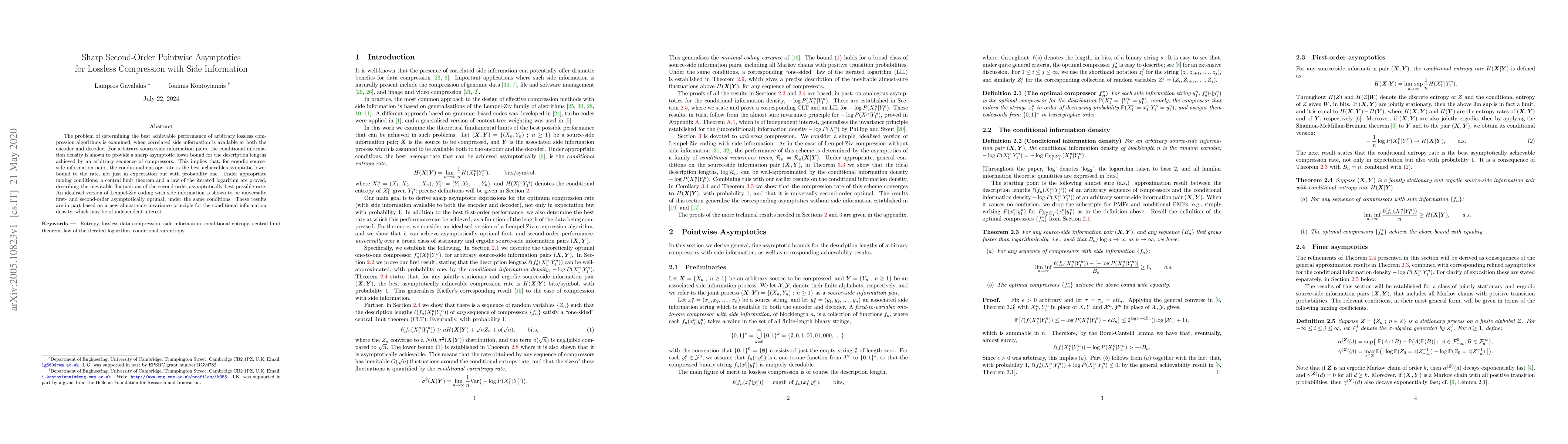 This paper investigates the optimal performance of lossless compression algorithms with side information, proving that the conditional information density provides a sharp asymptotic lower bound. It demonstrates that under mixing conditions, the conditional entropy rate is the best achievable lower bound, and presents a central limit theorem and law of the iterated logarithm for the second-order asymptotic fluctuations.