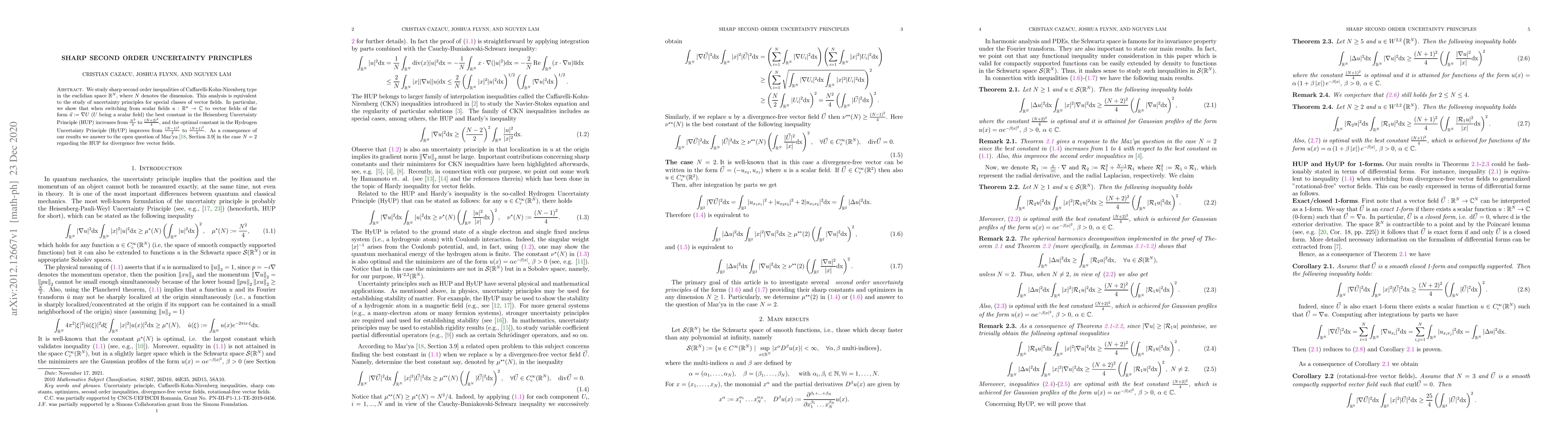 Researchers studied sharp second-order uncertainty principles in Euclidean space, finding that vector fields increase the best constants of the Heisenberg Uncertainty Principle and Hydrogen Uncertainty Principle compared to scalar fields.