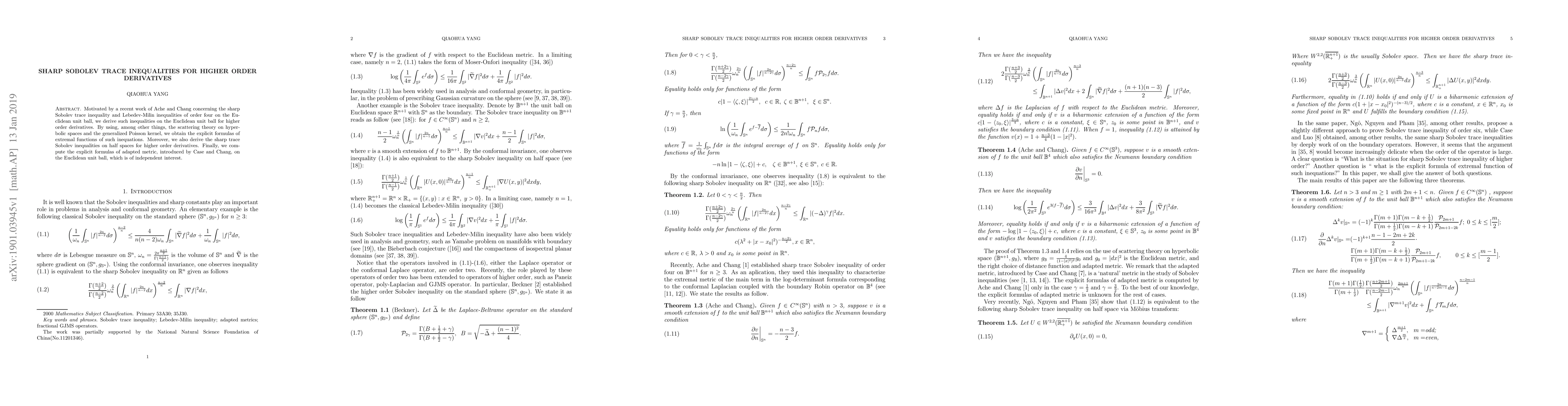 Motivated by a recent work of Ache and Chang concerning the sharp Sobolev trace inequality and Lebedev-Milin inequalities of order four on the Euclidean unit ball, we derive such inequalities on the Euclidean unit ball for higher order derivatives. By using, among other things, the scattering theory on hyperbolic spaces and the generalized Poisson kernel, we obtain the explicit formulas of extremal functions of such inequations. Moreover, we also derive the sharp trace Sobolev inequalities on half spaces for higher order derivatives. Finally, we compute the explicit formulas of adapted metric, introduced by Case and Chang, on the Euclidean unit ball, which is of independent interest.