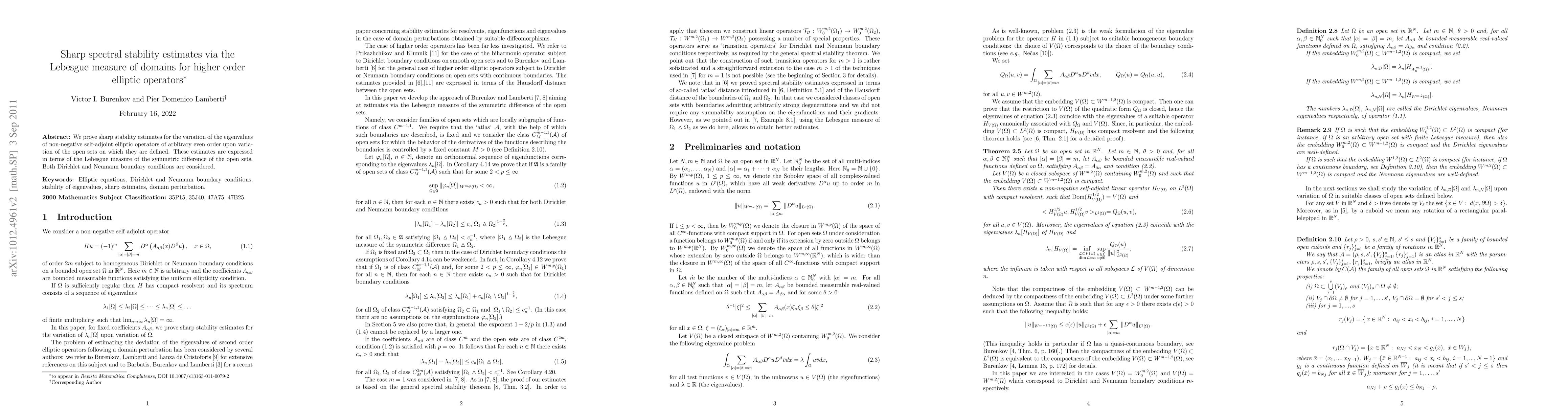 We prove sharp stability estimates for the variation of the eigenvalues of non-negative self-adjoint elliptic operators of arbitrary even order upon variation of the open sets on which they are defined. These estimates are expressed in terms of the Lebesgue measure of the symmetric difference of the open sets. Both Dirichlet and Neumann boundary conditions are considered.