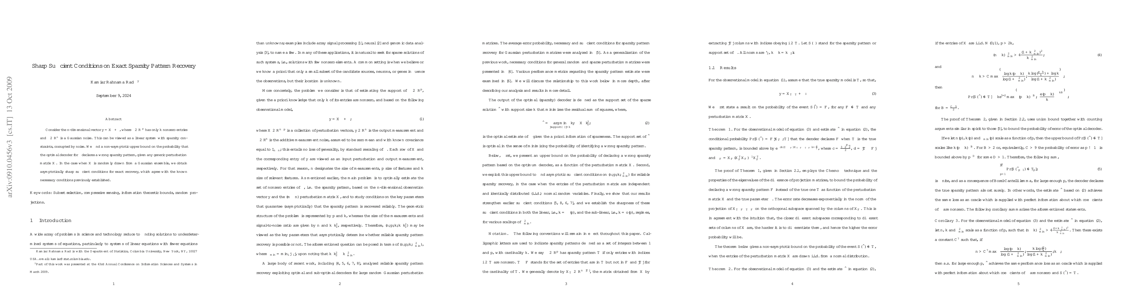 Consider the $n$-dimensional vector $y=X\be+\e$, where $\be \in \R^p$ has only $k$ nonzero entries and $\e \in \R^n$ is a Gaussian noise. This can be viewed as a linear system with sparsity constraints, corrupted by noise. We find a non-asymptotic upper bound on the probability that the optimal decoder for $\beta$ declares a wrong sparsity pattern, given any generic perturbation matrix $X$. In the case when $X$ is randomly drawn from a Gaussian ensemble, we obtain asymptotically sharp sufficient conditions for exact recovery, which agree with the known necessary conditions previously established.
