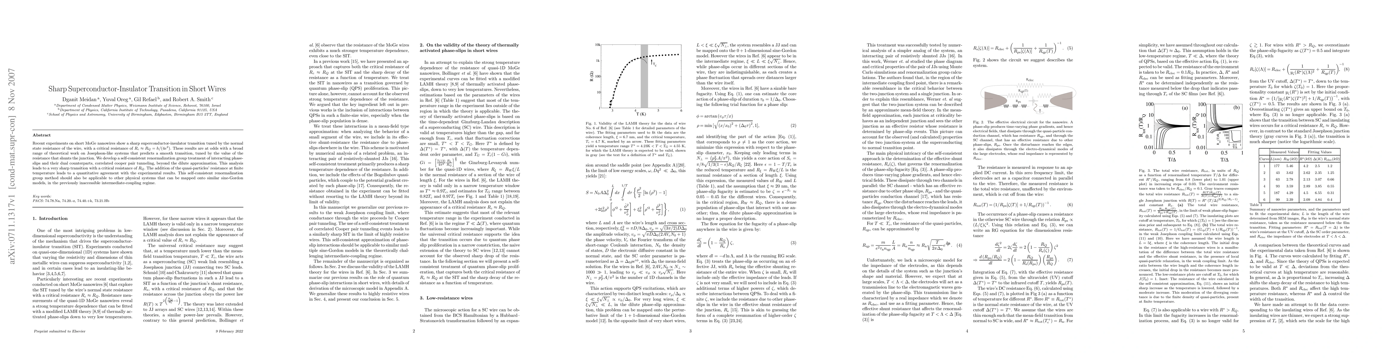 This paper reports a sharp superconductor-insulator transition in short MoGe nanowires, contradicting theoretical predictions of a smooth transition. The authors propose a self-consistent renormalization group method to explain the sharp transition, achieving quantitative agreement with experiments and suggesting applicability to other intermediate-coupling systems.
