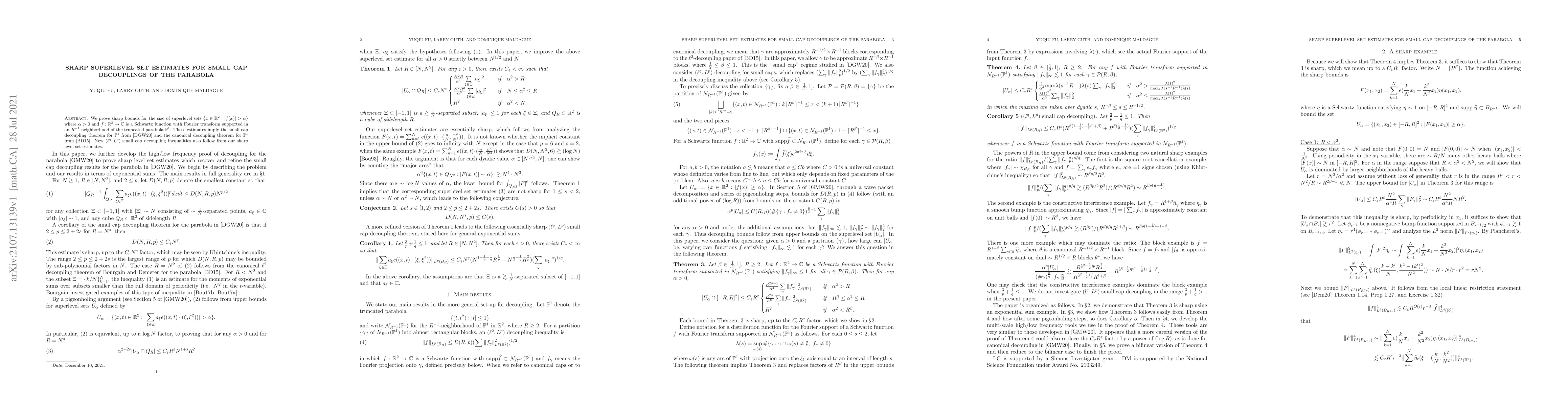 This paper establishes sharp bounds for the size of superlevel sets of a specific class of Schwartz functions, providing implications for the small cap decoupling theorem and canonical decoupling theorem for the truncated parabola. Additionally, it introduces new $(\ell^q,L^p)$ small cap decoupling inequalities.