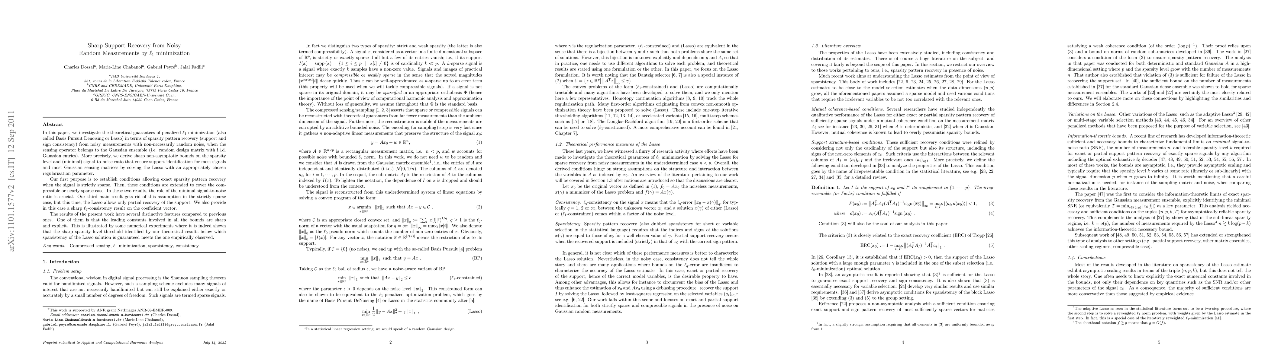 This paper investigates the theoretical guarantees of L1 minimization for recovering sparse signal supports from noisy measurements, particularly focusing on the Gaussian ensemble of random sensing matrices. The authors derive sharp non-asymptotic bounds for exact and partial support recovery under varying sparsity and signal-to-noise conditions, highlighting the importance of minimal signal-to-noise ratio and presenting explicit leading constants in their bounds.