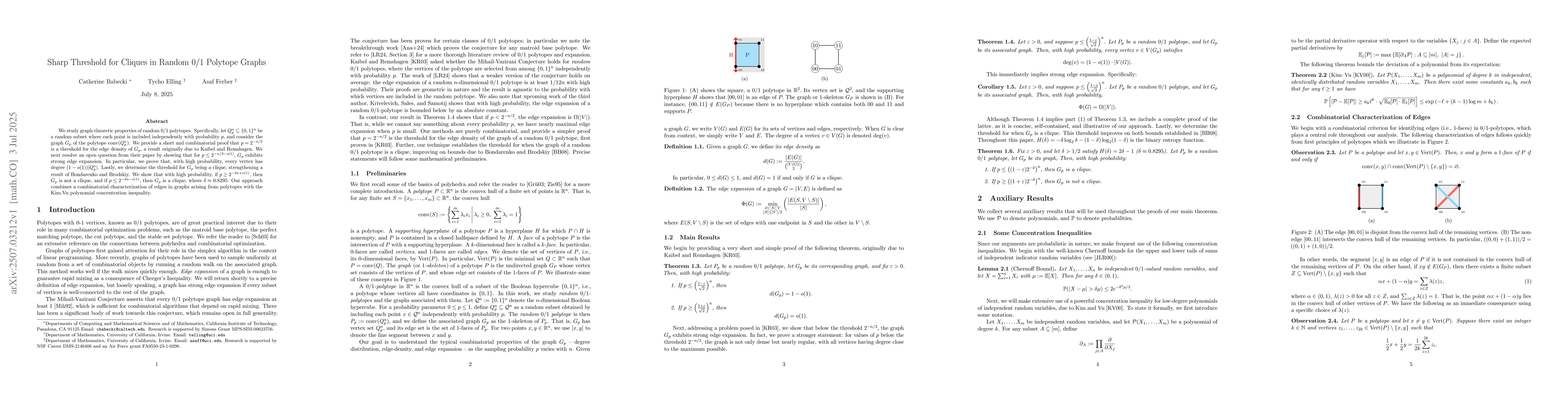 We study graph-theoretic properties of random $0/1$ polytopes. Specifically, let $Q_p^n \subseteq \{0,1\}^n$ be a random subset where each point is included independently with probability $p$, and consider the graph $G_p$ of the polytope conv$(Q_p^n)$. We provide a short and combinatorial proof that $p = 2^{-n/2}$ is a threshold for the edge density of $G_p$, a result originally due to Kaibel and Remshagen. We next resolve an open question from their paper by showing that for $p \leq 2^{-n/2 - o(1)}$, $G_p$ exhibits strong edge expansion. In particular, we prove that, with high probability, every vertex has degree $(1 - o(1))|Q_p^n|$. Lastly, we determine the threshold for $G_p$ being a clique, strengthening a result of Bondarenko and Brodskiy. We show that with high probability, if $p \geq 2^{-\delta n + o(1)}$, then $G_p$ is not a clique, and if $ p \leq 2^{-\delta n - o(1)}$, then $G_p$ is a clique, where $\delta \approx 0.8295$. Our approach combines a combinatorial characterization of edges in graphs arising from polytopes with the Kim-Vu polynomial concentration inequality.