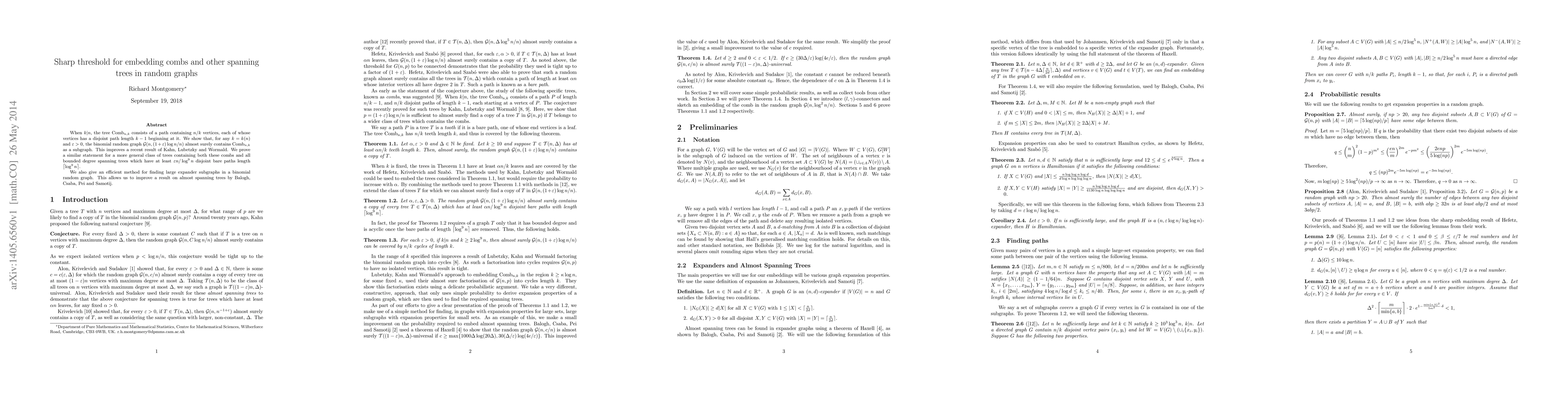 This paper demonstrates a sharp threshold for embedding specific comb-like trees and other bounded degree spanning trees in random graphs, improving upon previous results. It also provides an efficient method for finding large expander subgraphs in binomial random graphs.