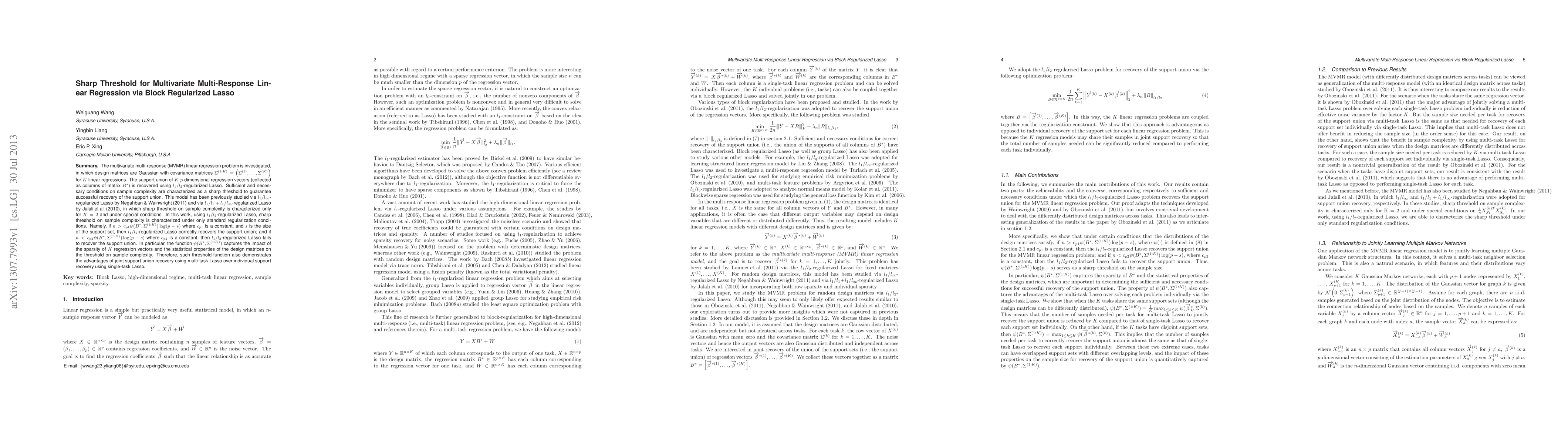 This paper studies a multivariate multi-response linear regression problem and uses $l_1/l_2$-regularized Lasso to recover the support union of regression vectors. It characterizes a sharp threshold for sample size that guarantees successful recovery, highlighting the impact of sparsity and design matrix properties.