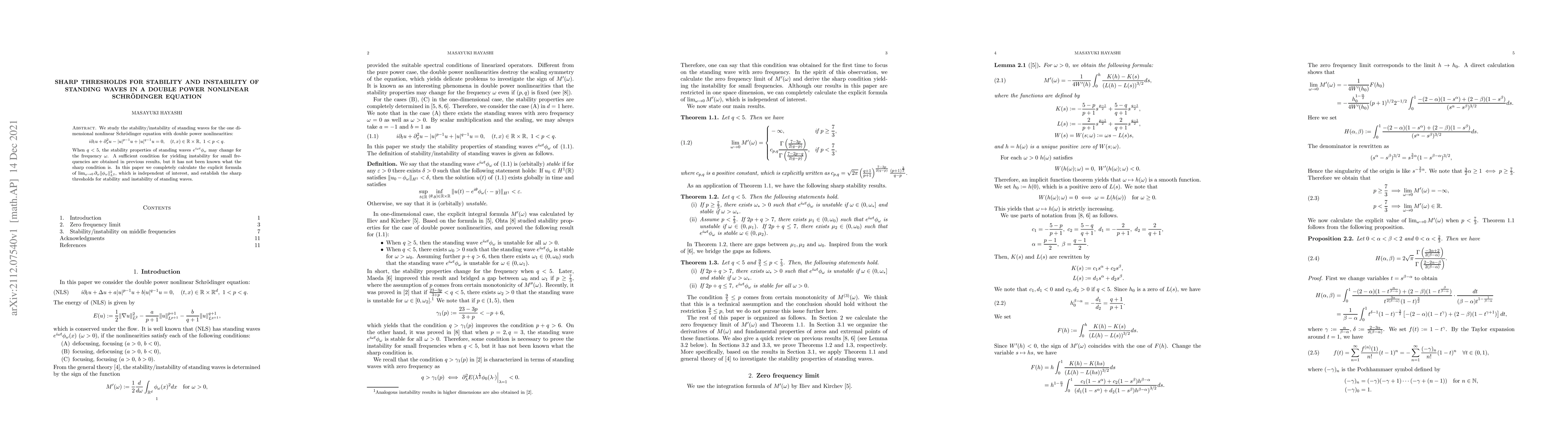 This paper investigates the stability and instability of standing waves in a one-dimensional nonlinear Schrödinger equation with double power nonlinearities. It establishes the sharp thresholds for the transition between stability and instability, providing an explicit formula for the critical frequency where the behavior changes.