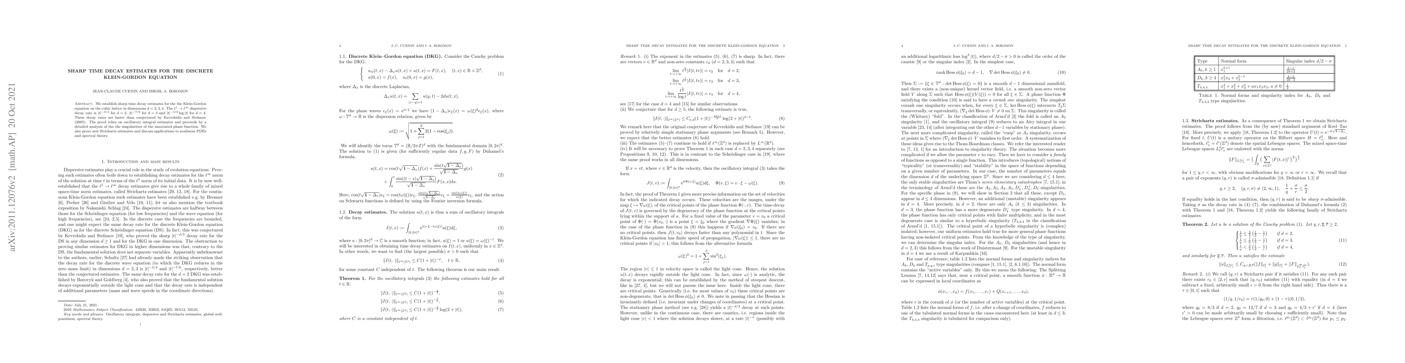 We establish sharp time decay estimates for the the Klein-Gordon equation on the cubic lattice in dimensions $d=2,3,4$. The $\ell^1\to\ell^{\infty}$ dispersive decay rate is $|t|^{-3/4}$ for $d=2$, $|t|^{-7/6}$ for $d=3$ and $|t|^{-3/2}\log|t|$ for $d=4$. These decay rates are faster than conjectured by Kevrekidis and Stefanov (2005). The proof relies on oscillatory integral estimates and proceeds by a detailed analysis of the the singularities of the associated phase function. We also prove new Strichartz estimates and discuss applications to nonlinear PDEs and spectral theory.