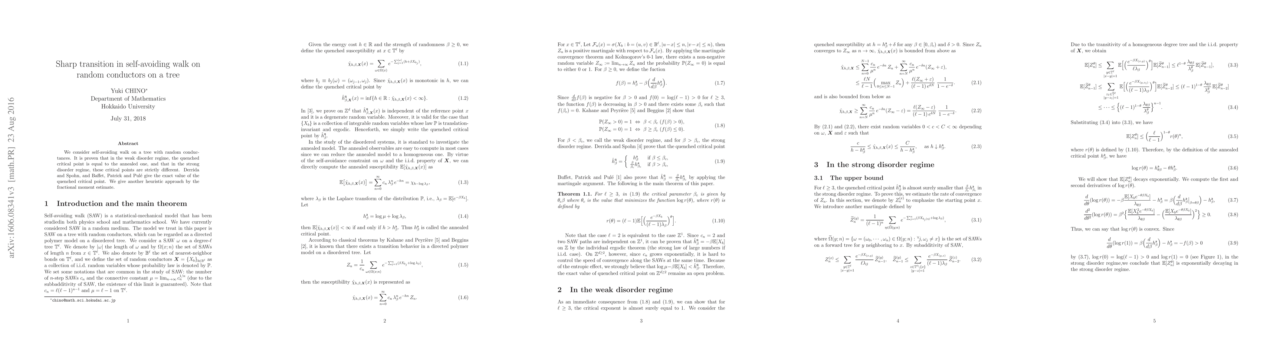 We consider self-avoiding walk on a tree with random conductances. It is proven that in the weak disorder regime, the quenched critical point is equal to the annealed one, and that in the strong disorder regime, these critical points are strictly different. Derrida and Spohn, and Baffet, Patrick and Pul$\acute{\rm e}$ give the exact value of the quenched critical point. We give another heuristic approach by the fractional moment estimate.