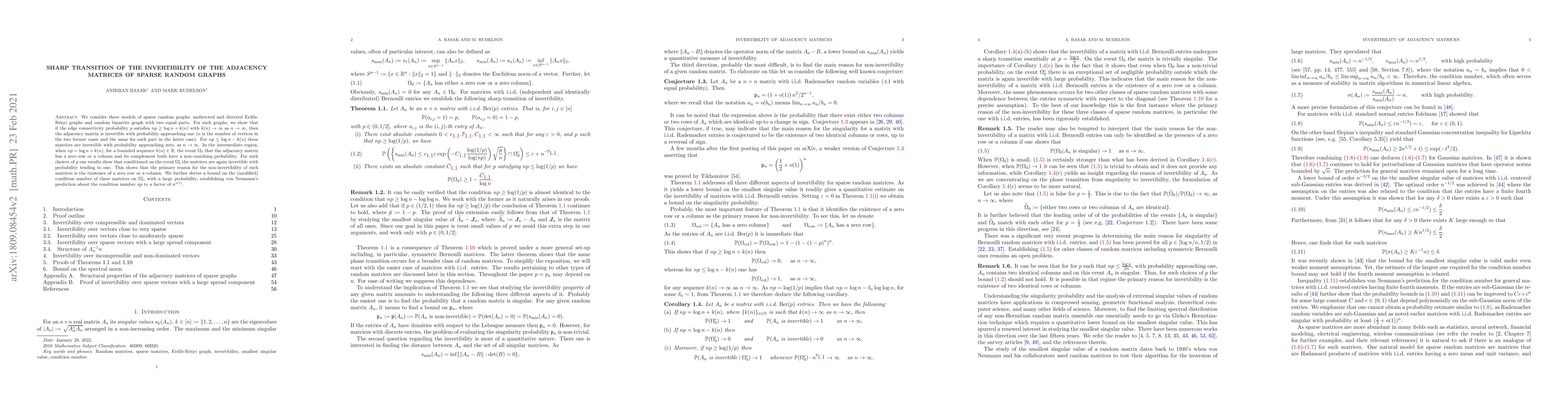 The paper establishes sharp thresholds for the invertibility of adjacency matrices of sparse random graphs, linking the invertibility to the smallest singular value and condition number.