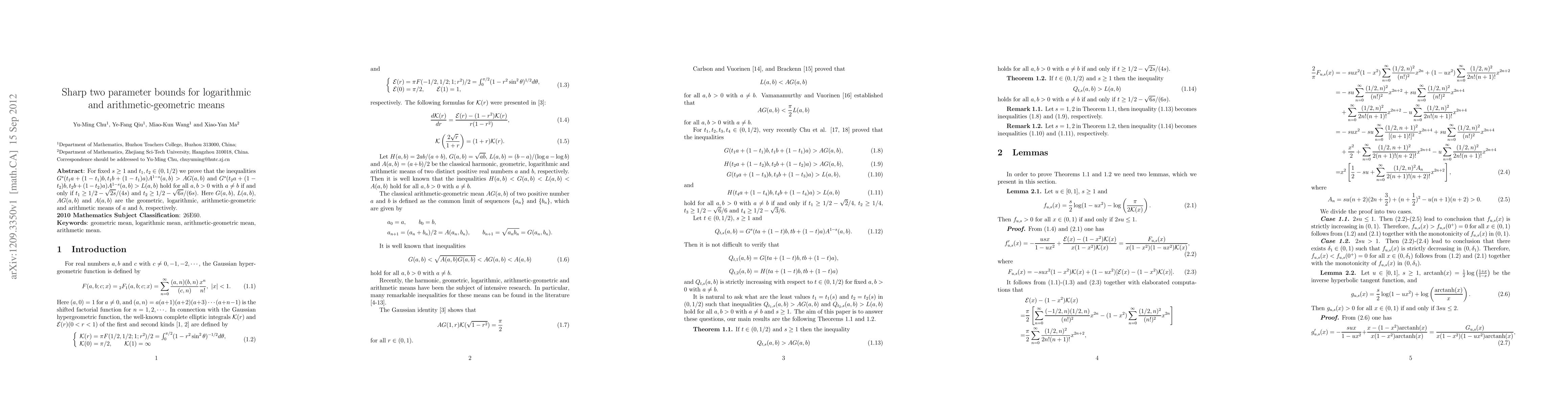 For fixed $s\geq 1$ and $t_{1},t_{2}\in(0,1/2)$ we prove that the inequalities $G^{s}(t_{1}a+(1-t_{1})b,t_{1}b+(1-t_{1})a)A^{1-s}(a,b)>AG(a,b)$ and $G^{s}(t_{2}a+(1-t_{2})b,t_{2}b+(1-t_{2})a)A^{1-s}(a,b)>L(a,b)$ hold for all $a,b>0$ with $a\neq b$ if and only if $t_{1}\geq 1/2-\sqrt{2s}/(4s)$ and $t_{2}\geq 1/2-\sqrt{6s}/(6s)$. Here $G(a,b)$, $L(a,b)$, $AG(a,b)$ and $A(a,b)$ are the geometric, logarithmic, arithmetic-geometric and arithmetic means of $a$ and $b$, respectively.