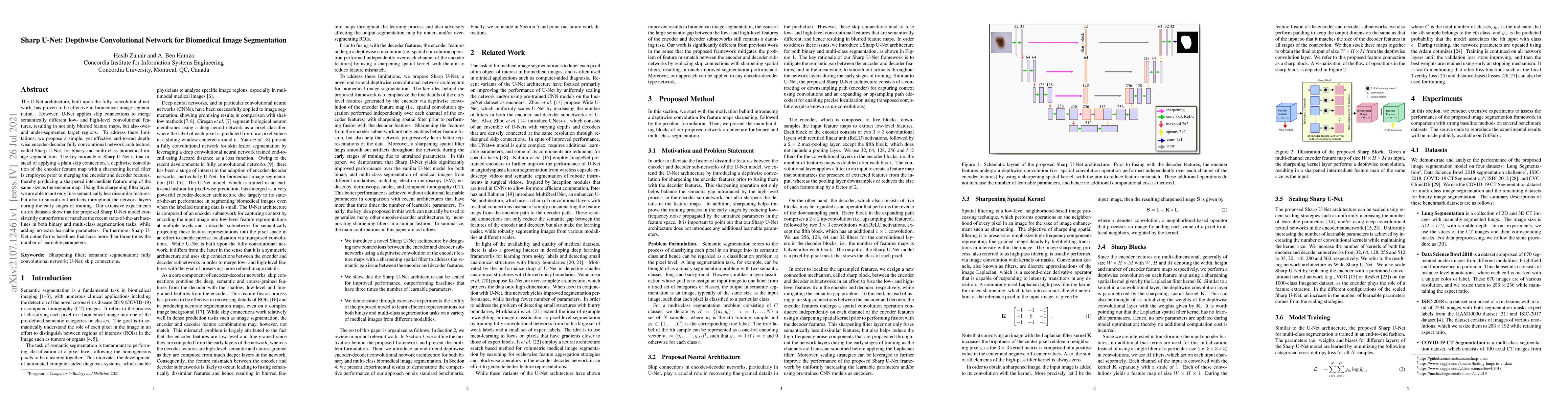 Sharp U-Net introduces a depthwise convolutional network to improve biomedical image segmentation, addressing issues with U-Net's skip connections. It employs a sharpening kernel to refine feature maps, leading to superior segmentation results without increasing model complexity.