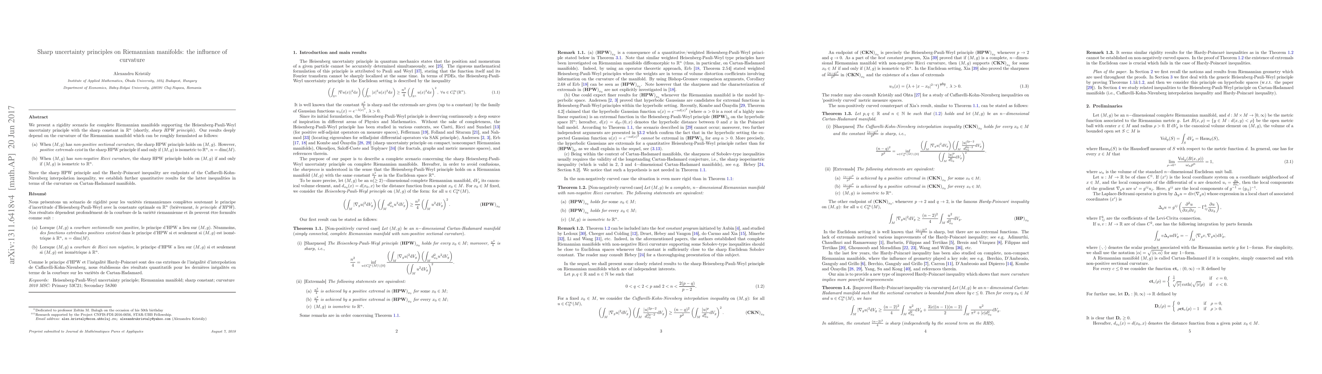 We present a rigidity scenario for complete Riemannian manifolds supporting the Heisenberg-Pauli-Weyl uncertainty principle with the sharp constant in $\mathbb R^n$ (shortly, sharp HPW principle). Our results deeply depend on the curvature of the Riemannian manifold which can be roughly formulated as follows: (a) When $(M,g)$ has non-positive sectional curvature, the sharp HPW principle holds on $(M,g)$. However, positive extremals exist in the sharp HPW principle if and only if $(M,g)$ is isometric to $\mathbb R^n$, $n={\rm dim}(M)$. (b) When $(M,g)$ has non-negative Ricci curvature, the sharp HPW principle holds on $(M,g)$ if and only if $(M,g)$ is isometric to $\mathbb R^n$. Since the sharp HPW principle and the Hardy-Poincar\'e inequality are endpoints of the Caffarelli-Kohn-Nirenberg interpolation inequality, we establish further quantitative results for the latter inequalities in terms of the curvature on Cartan-Hadamard manifolds.