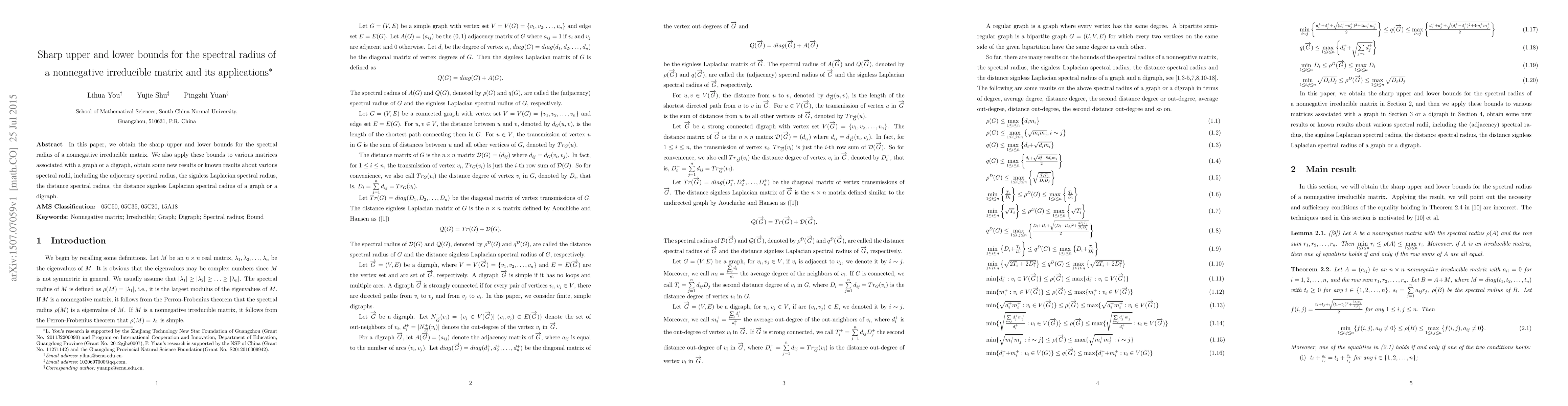 This paper establishes precise upper and lower bounds for the spectral radius of nonnegative irreducible matrices. It applies these bounds to matrices related to graphs and digraphs, yielding new insights and confirming known results about various spectral radii.