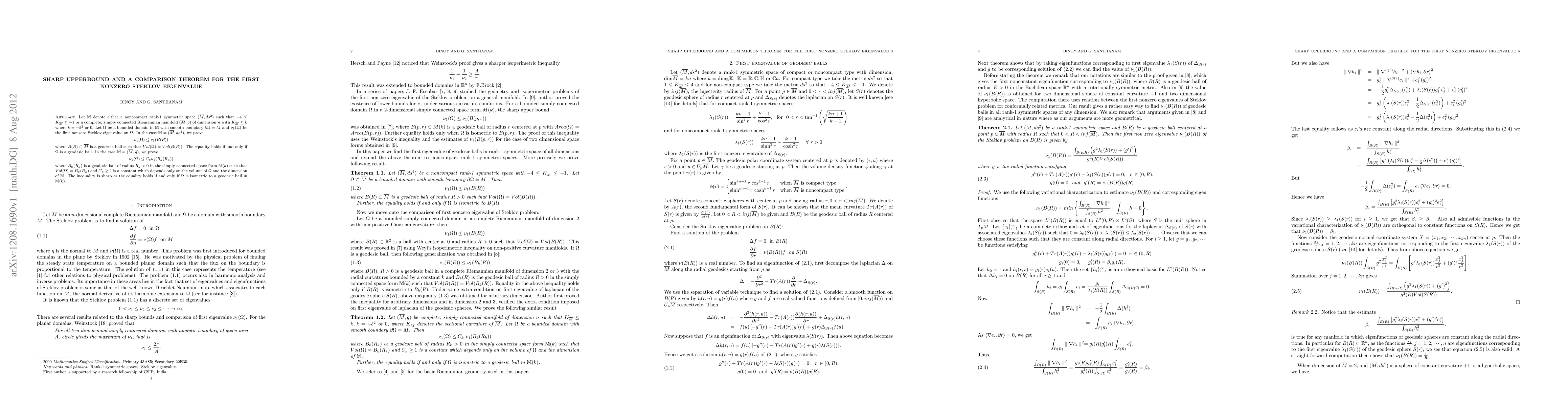 This paper establishes that geodesic balls maximize the first nonzero Steklov eigenvalue among domains with smooth boundaries in rank-1 symmetric spaces of noncompact type, given a fixed volume. It also provides a comparison theorem for the first nonzero Steklov eigenvalue in simply connected Riemannian manifolds with specific curvature constraints.