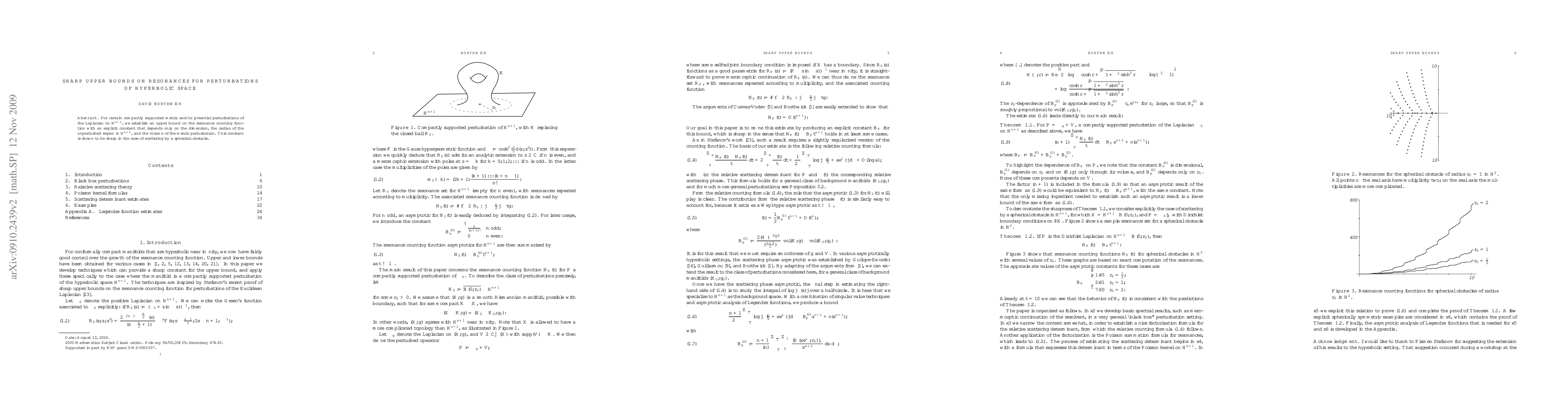 Researchers establish sharp upper bounds on resonances for certain perturbations of hyperbolic space, with constants depending on dimension, radius, and volume.