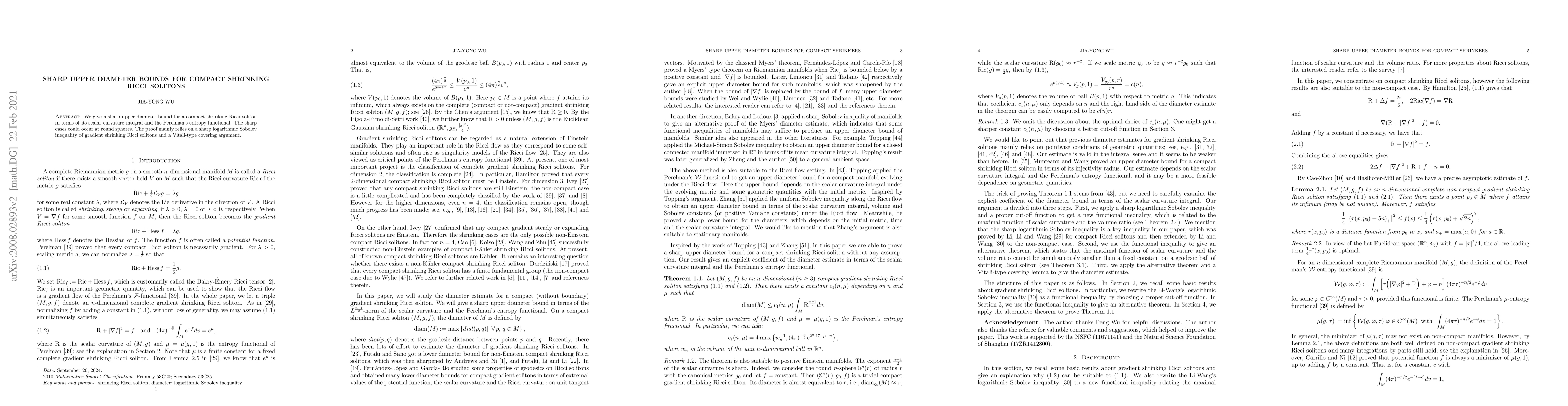 This paper establishes a precise upper diameter limit for compact shrinking Ricci solitons based on their scalar curvature integral and Perelman's entropy functional, with sharp cases potentially realized on round spheres. The proof utilizes a sharp logarithmic Sobolev inequality and a Vitali-type covering argument.