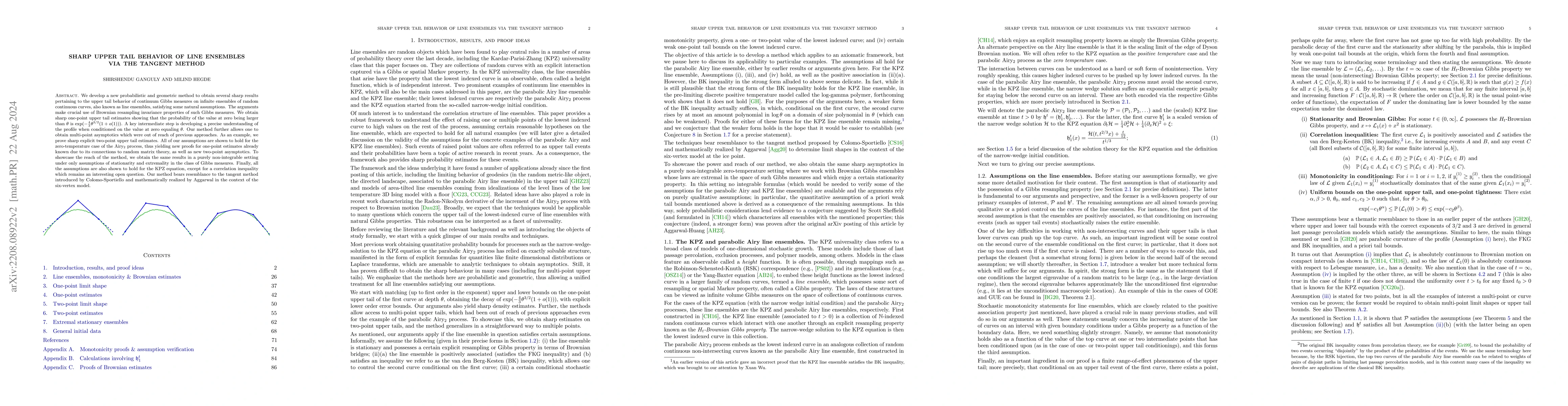 We develop a new probabilistic and geometric method to obtain several sharp results pertaining to the upper tail behavior for the Kardar-Parisi-Zhang (KPZ) equation in a unified way. The arguments make crucial use of Brownian resampling invariance properties of Gibbs measures on infinite ensembles of random continuous curves into which the KPZ equation (under narrow-wedge initial data) can be embedded. We obtain sharp one-point upper tail estimates, uniformly in the time parameter, showing that the probability of the value at zero being larger than $\theta$ is $\exp(-\frac{4}{3}\theta^{3/2}(1+o(1)))$, for a general class of initial data including the narrow-wedge. Our arguments also yield the first known density estimates for the narrow-wedge case, which are optimal. A key intermediate step is developing a precise understanding of the profile when conditioned on the value at zero equaling $\theta$. Our method further allows one to obtain multi-point asymptotics which were out of reach of previous approaches. As an example, we prove sharp explicit two-point upper tail estimates. All of our arguments also apply to the zero-temperature case of the Airy$_2$ process; even here, while some of the one-point estimates were already available due to its connections to random matrix theory, the two-point asymptotics are new. Finally, to showcase the reach of the method, we obtain the same results in a purely non-integrable setting under only assumptions of stationarity and extremality in the class of Gibbs measures, thus providing evidence in favour of a conjecture suggested by Sheffield and formulated by Corwin-Hammond on a characterization of such line ensembles. Our method bears resemblance to the tangent method introduced by Colomo-Sportiello and mathematically realized by Aggarwal in the context of the six-vertex model.