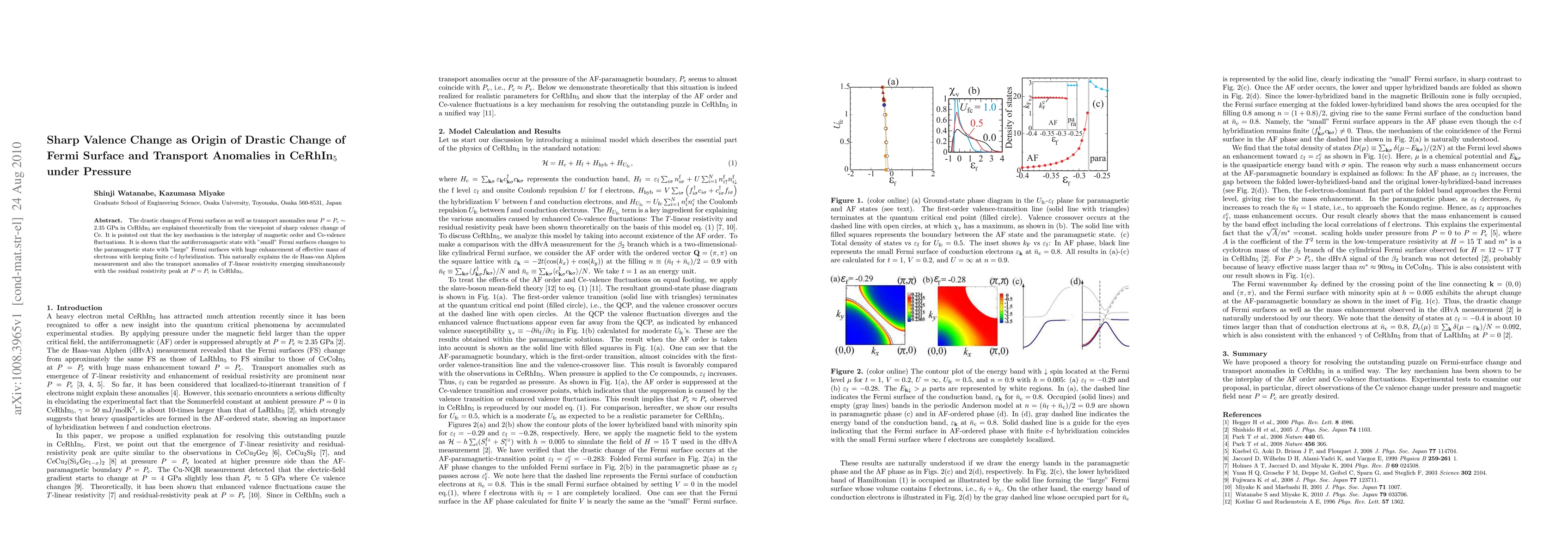 CeRhIn5 undergoes drastic changes in Fermi surface and transport properties when pressure is applied above a critical point (Pc = 2.35 GPa), driven by a sharp valence change in Ce and the interplay of magnetic order and electron hybridization.